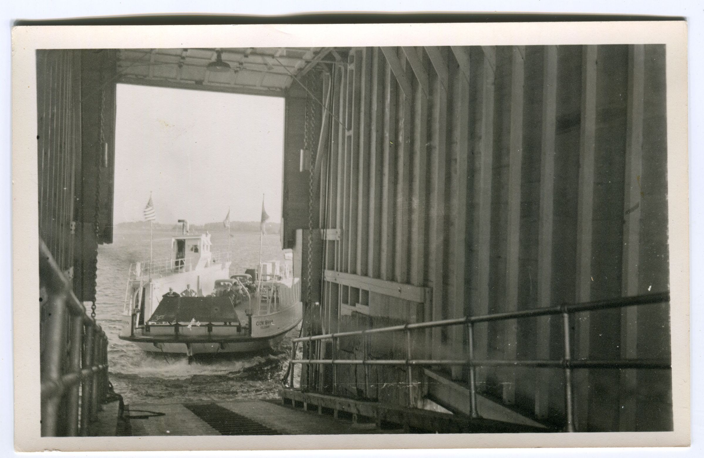 Black and white postcard showing the Gov. Brann leaving the ferry slip. The picture is taken looking down through a wooden building through which the boarding ramp runs.