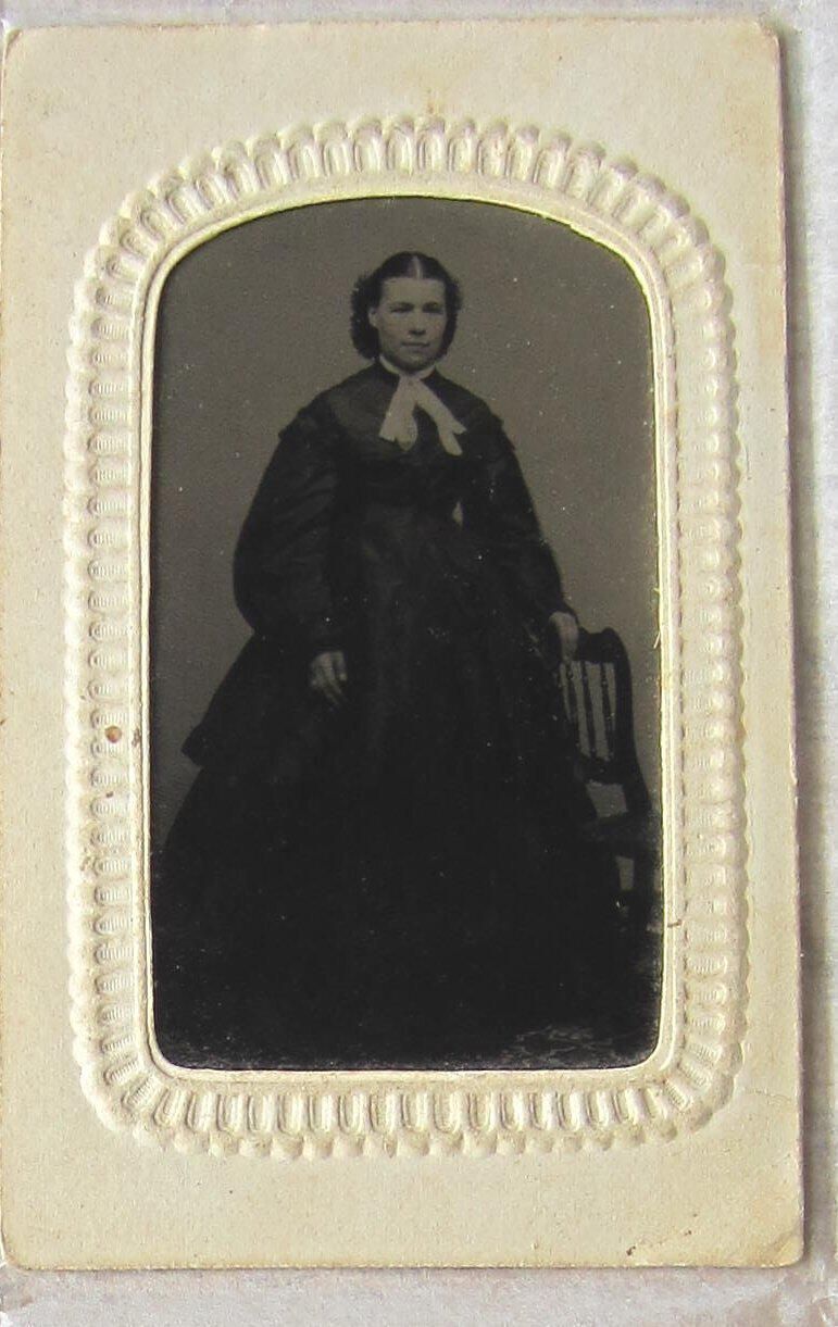 Unframed, matted, daguerreotype of young woman, full length, identified on back as Linda Monroe, Lincolnville, ME. Black dress, full skirted with coat, mid-late 19th c., mourning(?). Cannot find a Linda Monroe in IHS genealogical information.