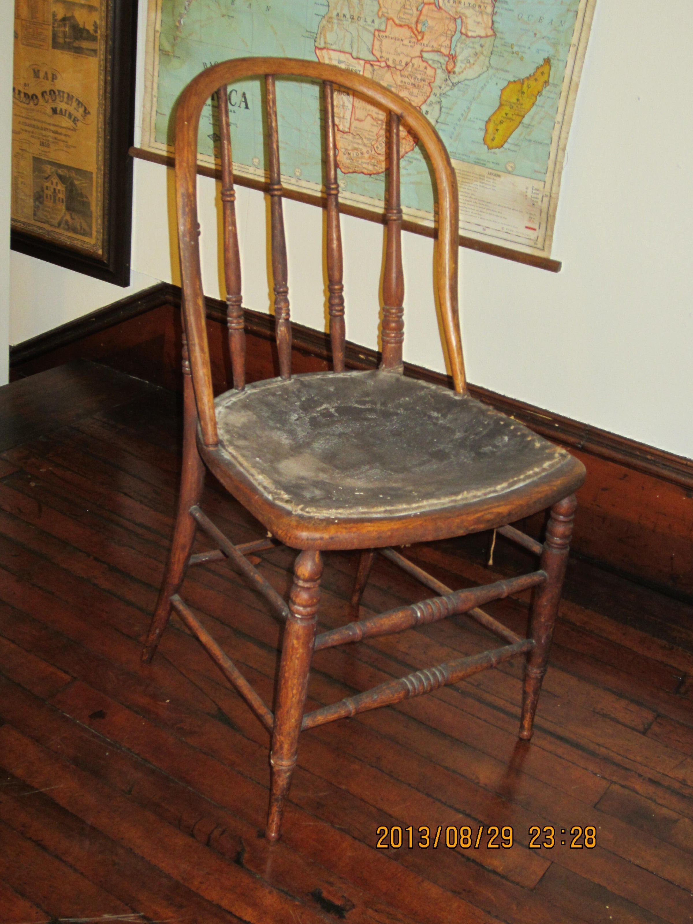 Bow back oak chair with turned spindles in back, upholstered seat (probably originally caned) and turned legs and braces.