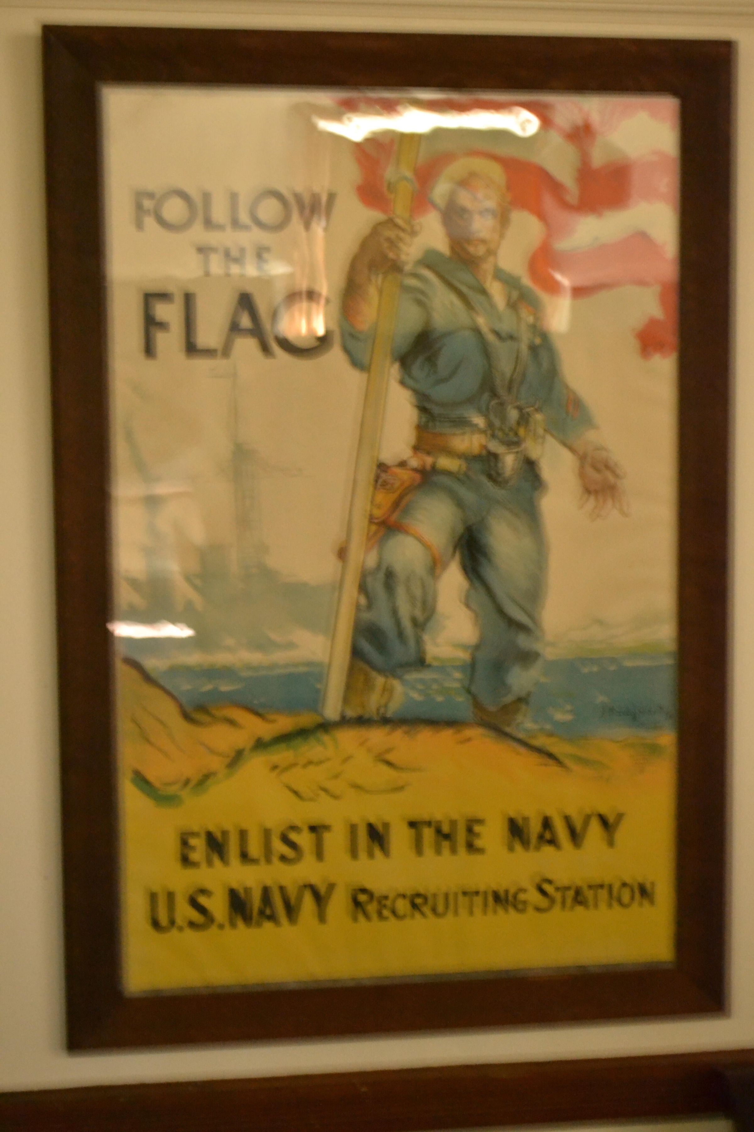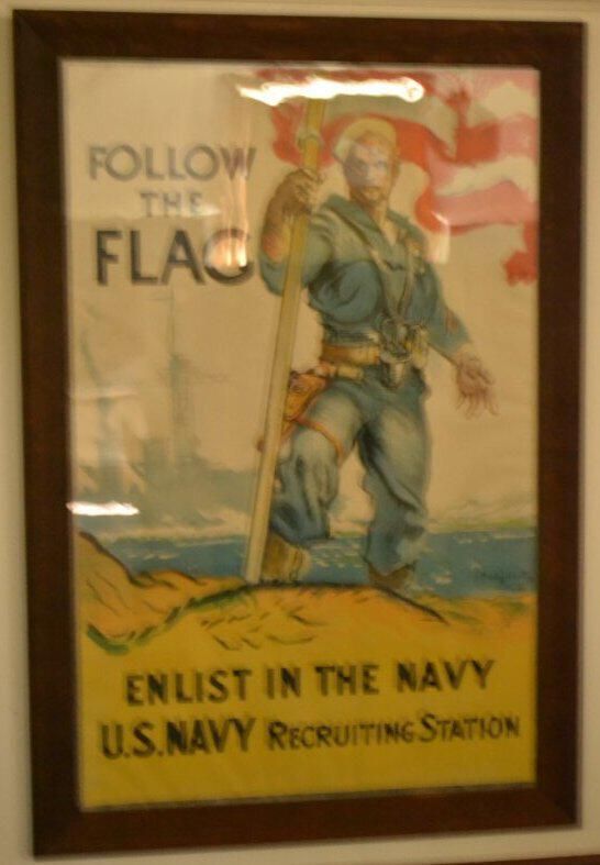 "Follow the Flag - Enlist in the Navy" poster showing a young man with swirling flag. c 2' x 3' framed.