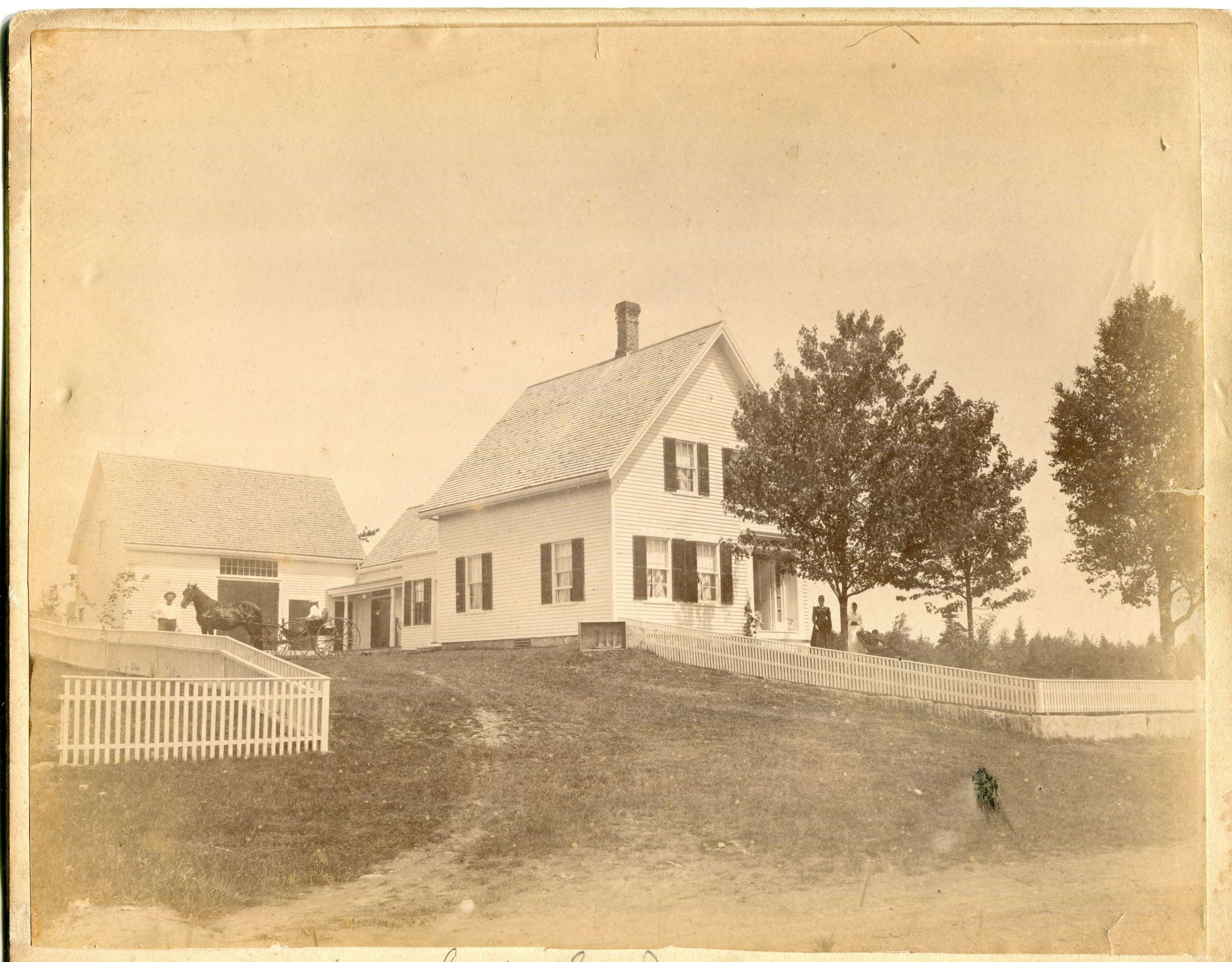 Capt Geo Warren house and barn, picket fence on granite foundation, horse and buggy and ? (Warren?) in front of barn, two ladies, one in black, one in white, by front door. Three young trees c. 8-10 yrs) in front yard. Everything in prime comdition. This is probably George A Warren, son of George Warren, grandson of Samuel Warren Jr. George A. Warren married Lucinda Parker, daughter of Thomas Parker. Pauline Byrd who inherited this house in c 1980 was a Parker......this is guesswork; Farrow is not helpful in establishing this relationship.