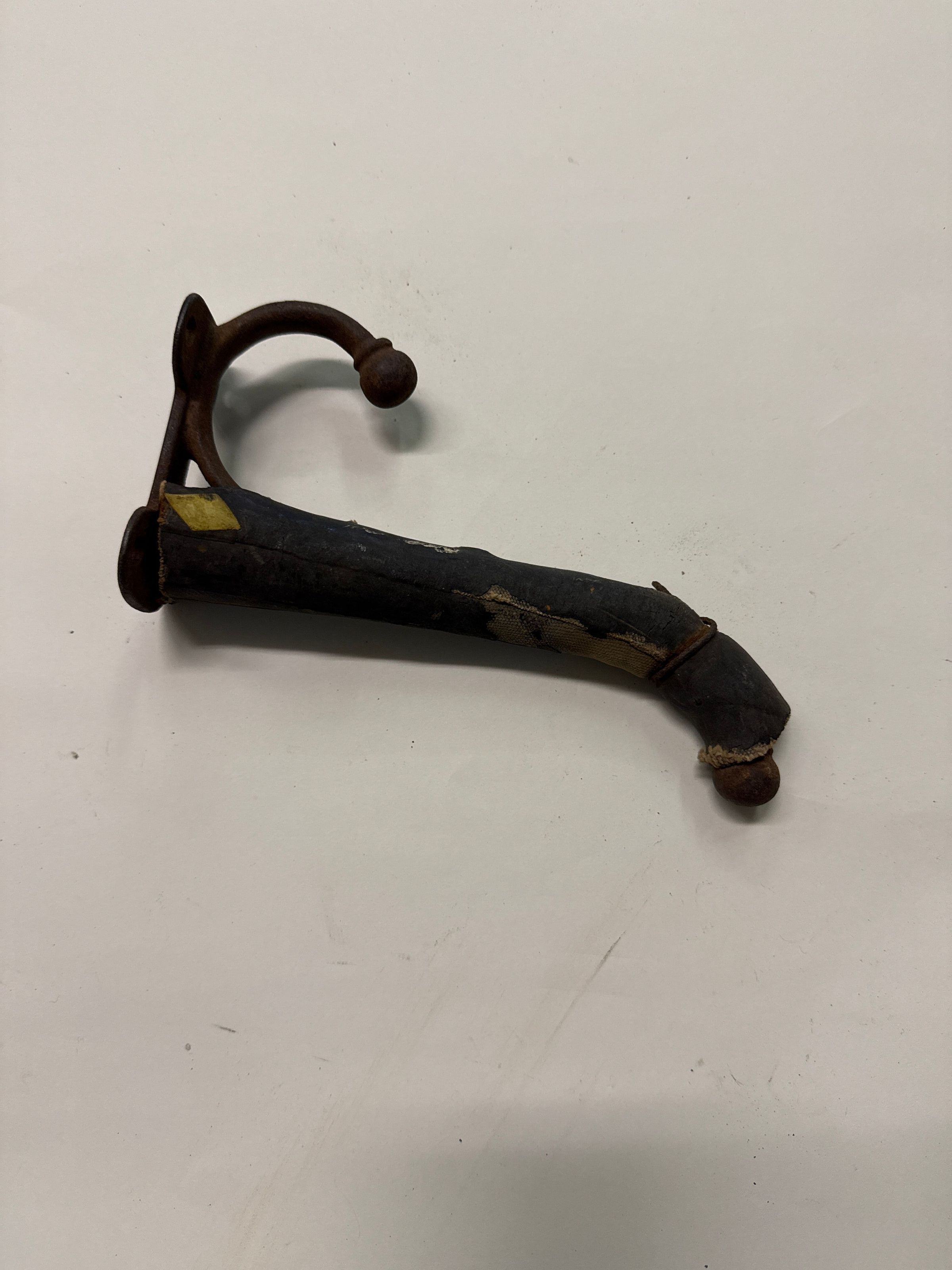 8 inches x 3 3/4 inches x 2 inches.. Has two hooks made of round metal, one 8 inches long, one 2 3/4 inches long. Hooks have round knobs on end. Hooks are attached to flat piece of metal that would be mounted flush to the wall. Has four holes for mounting. Long look is covered in black leather.