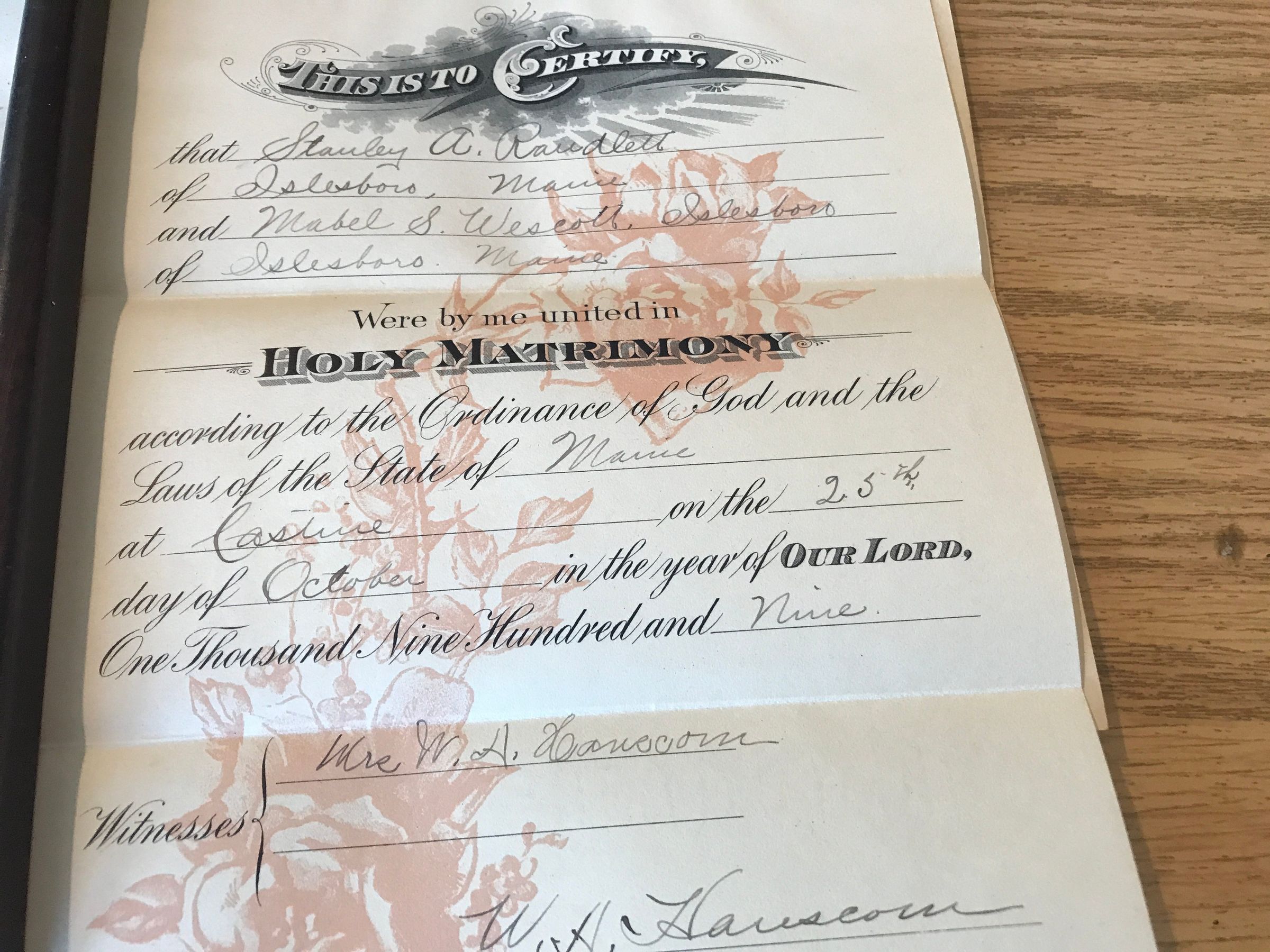 Marriage certificate entitled "Bridal Bond" on cover. Marriage of Stanley A. Randlett and Mabel S. Wescott in Castine, ME on October 25, 1909.