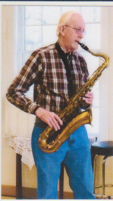 2X3 laminated photo, Fernald playing his saxophone. On back "In Loving Memory..." and a quote "Time spent playing saxophone is not deducted from one's life span. From a note Dad had taped to his saxophone case"