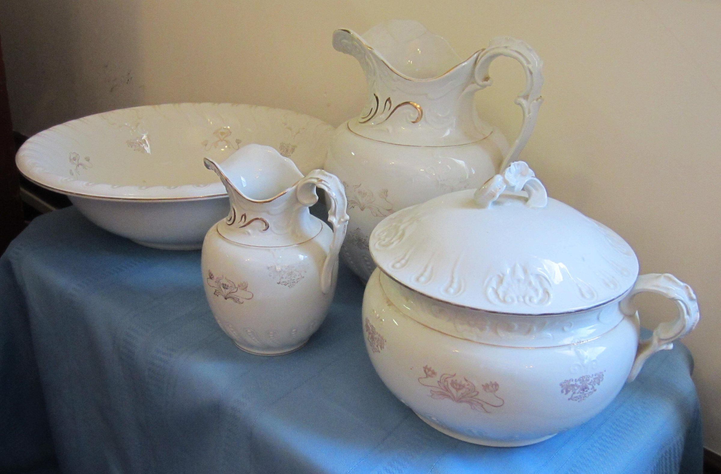 Small pitcher from Williams commode set, c 10" H, gold leaf design and intricate molding of handle and lip. See 005.001 for provenance.