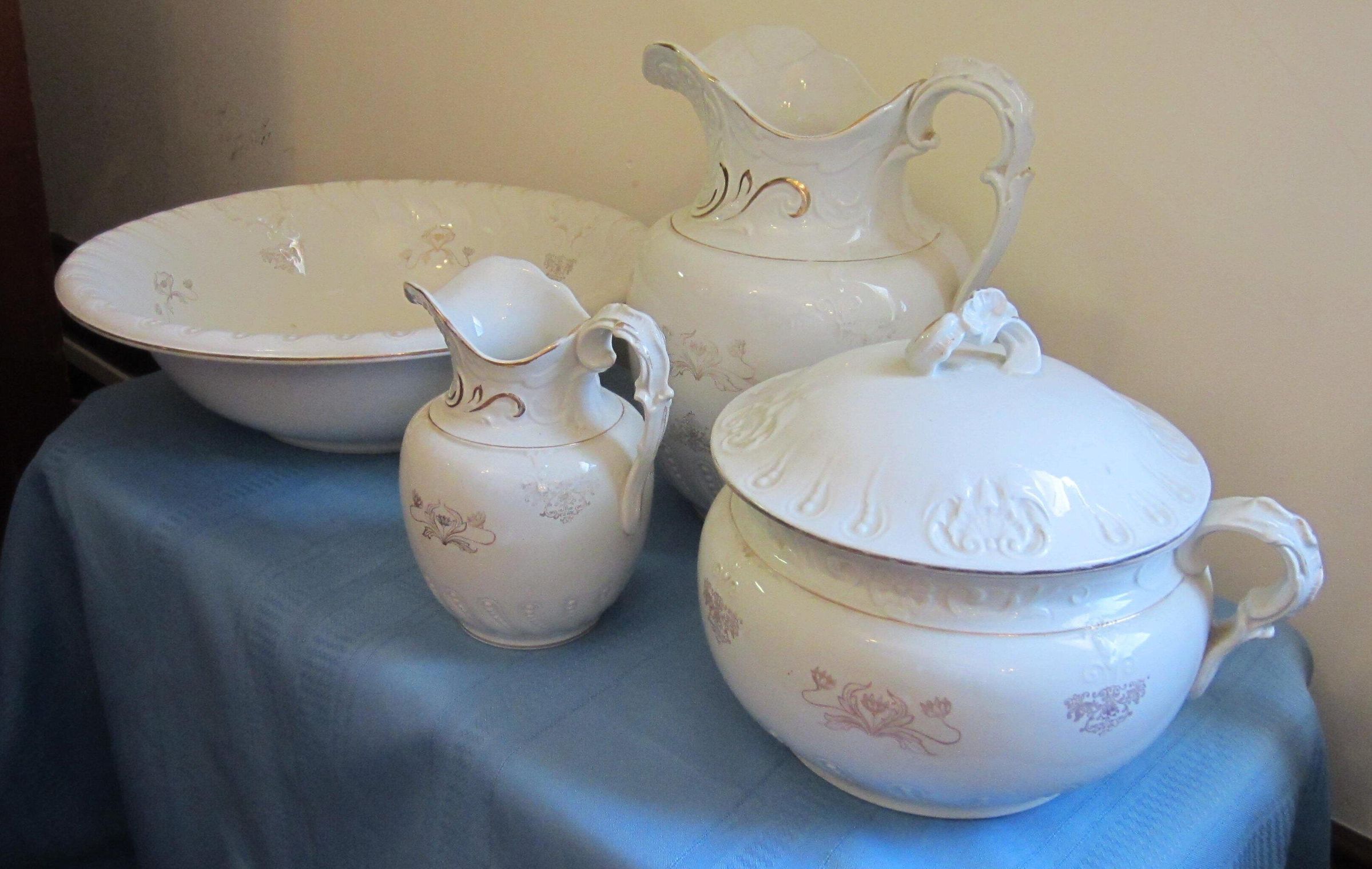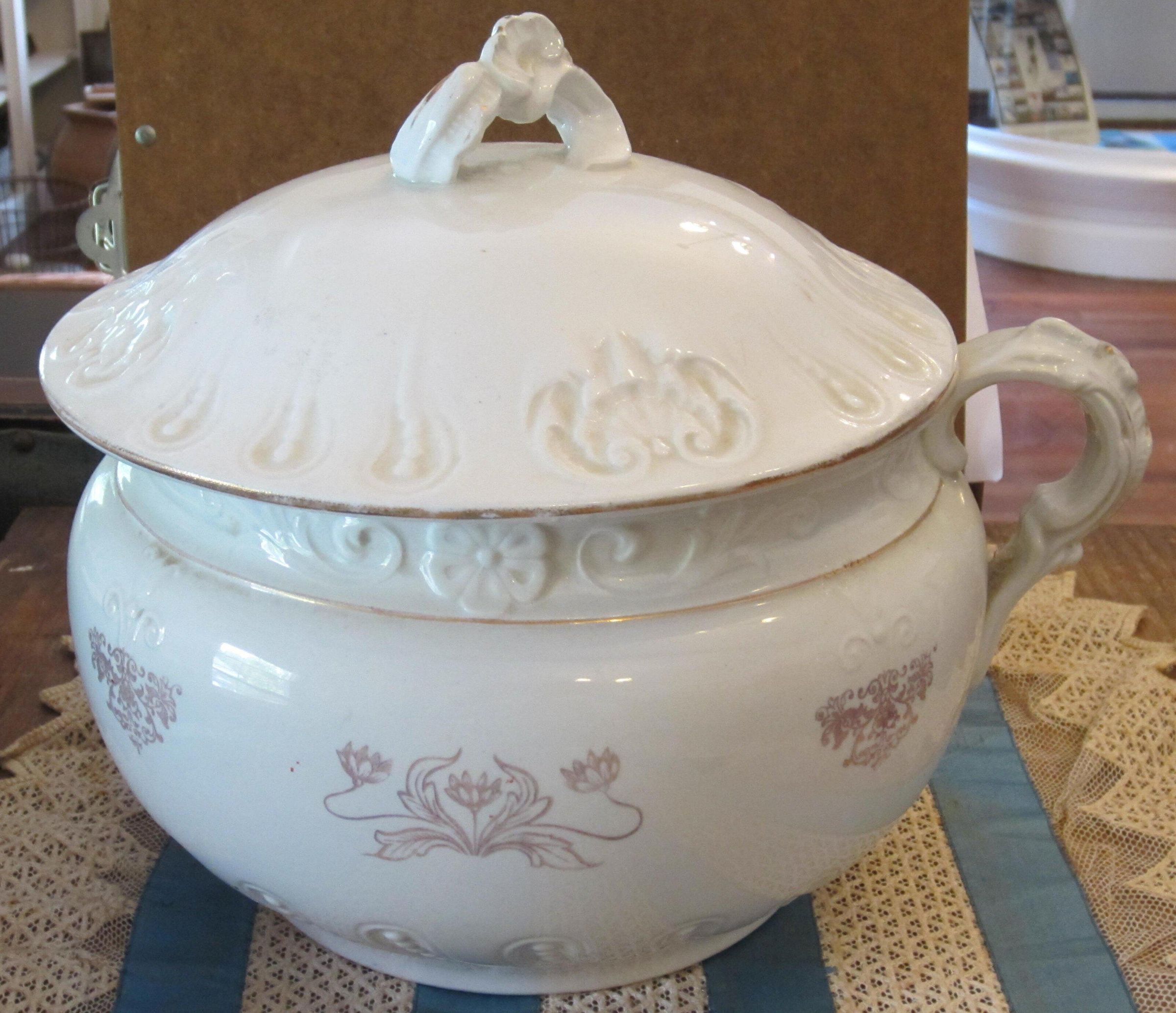 Chamber Pot with Lid from Williams commode set, white china with gold leaf decoration, no maker's mark. See .001 for provenance