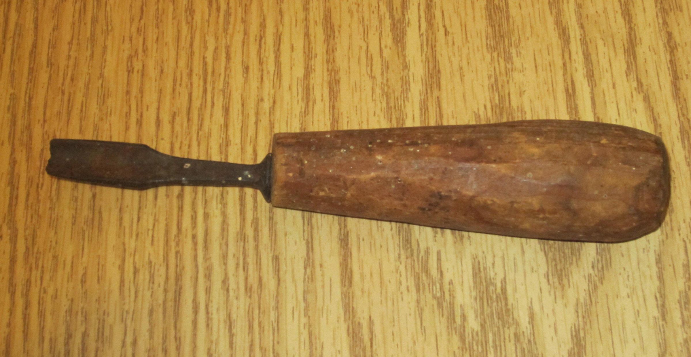woodworking chical with homemade handle, iron blade for gouging 1/2" trough. Total length 7.25". Working edge of gouge well worn. Found in Heald sewing machine.