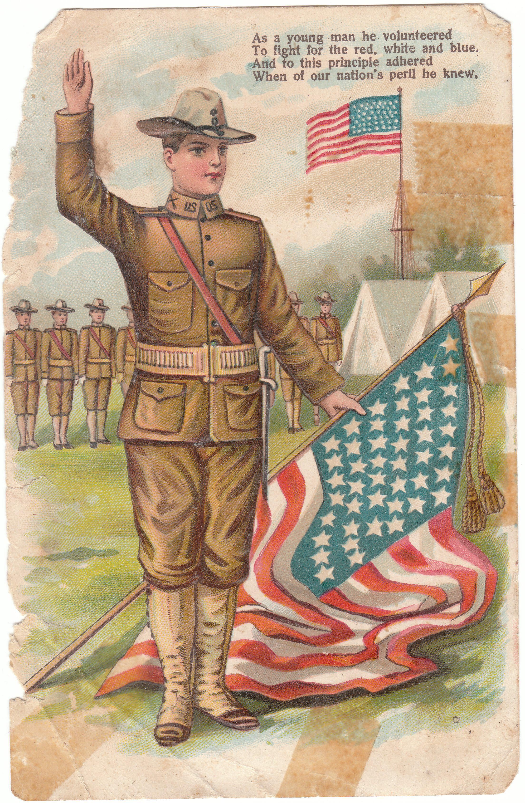3.5" x 5.5" postcard from World War 1, showing soldier in uniform holding US flag with opther troops in background. In top right corner a poem "As a young man he volunteered / To fight for the red white and blue / And to this principle adhered / When of our nation's peril he knew." Nothing written on back.