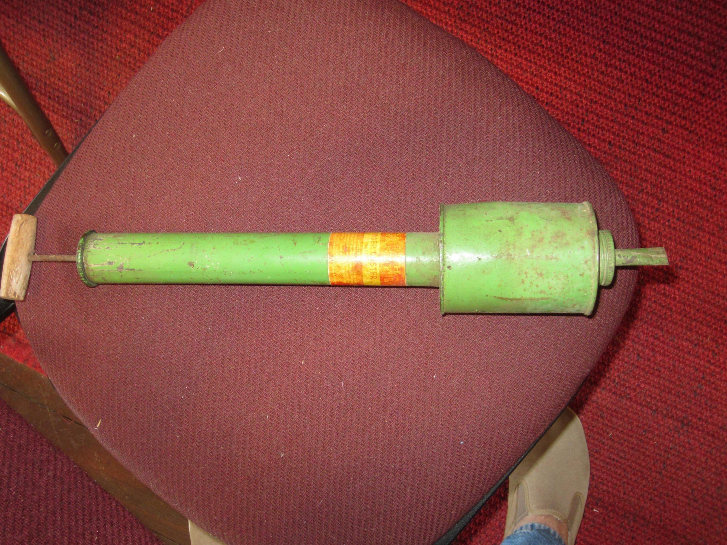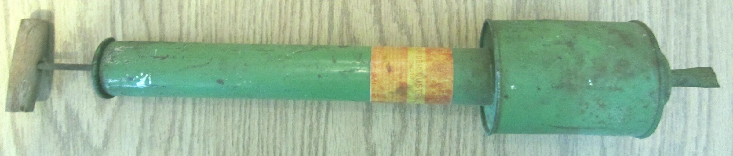 A hand sprayer for application of dusting powder to plants, c 16" long overall, with a 3"diameter cylinder at one end (to hold the dusting powder) with a screwtop (for filling the cylinder) with a spray nozzle, all set on a 1.5" diameter barrel surrounding a 10" long plunger mechanism to propel the powder through the nozzle.