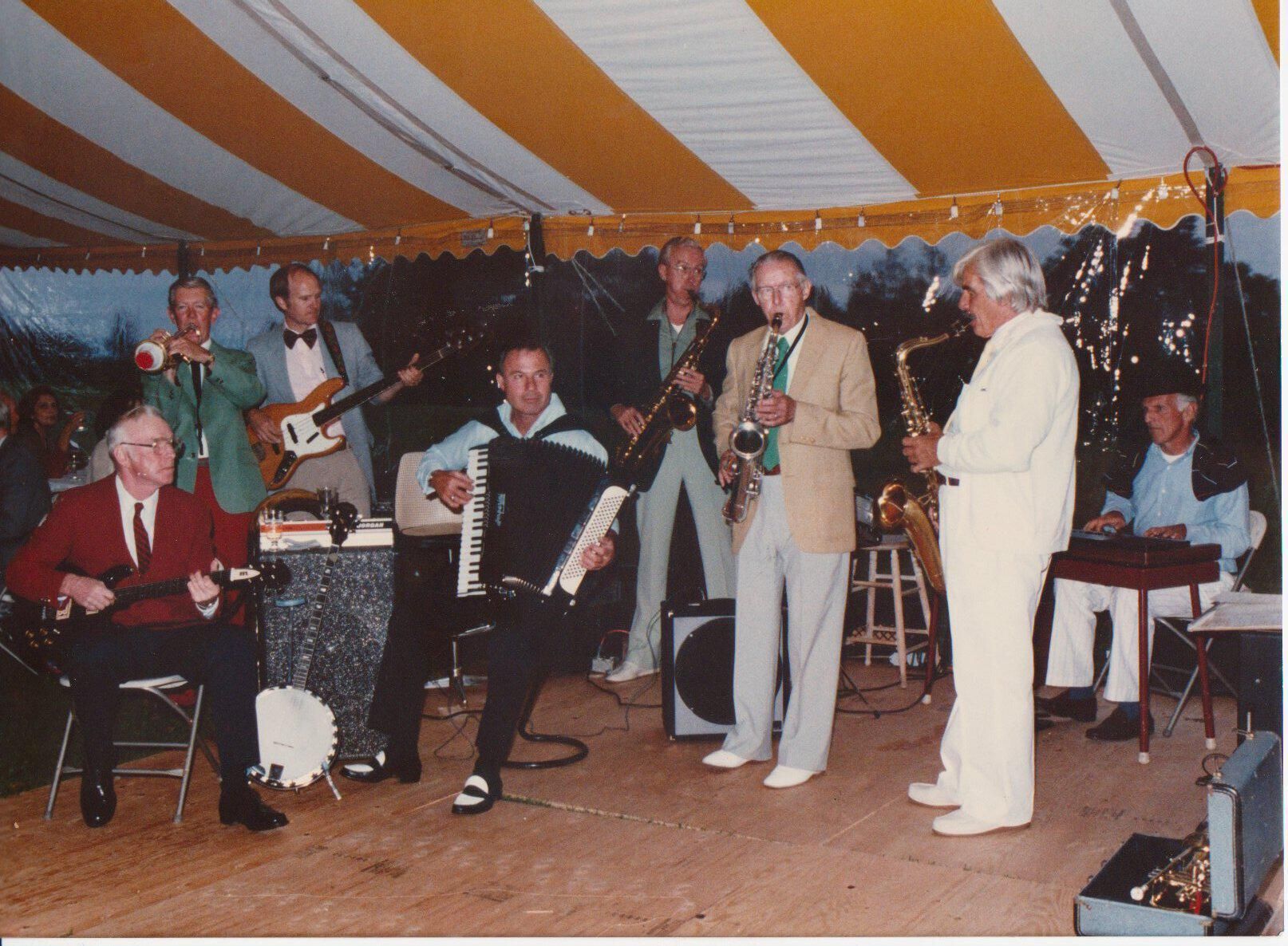 8x12 color print of photo of The Charlie Pendleton Band c.1985: L-R Stanwood Pendleton (guitar), Jack Coffin (trumpet), John Oldham (guitar), Charlie Pendleton (accordian), Fernald Fairfield (sax), Robert E Clayton Jr (sax), Joe(Joseph B.) Pendleton (sax), Donny Pendleton (keyboard). Under a tent, summertime.