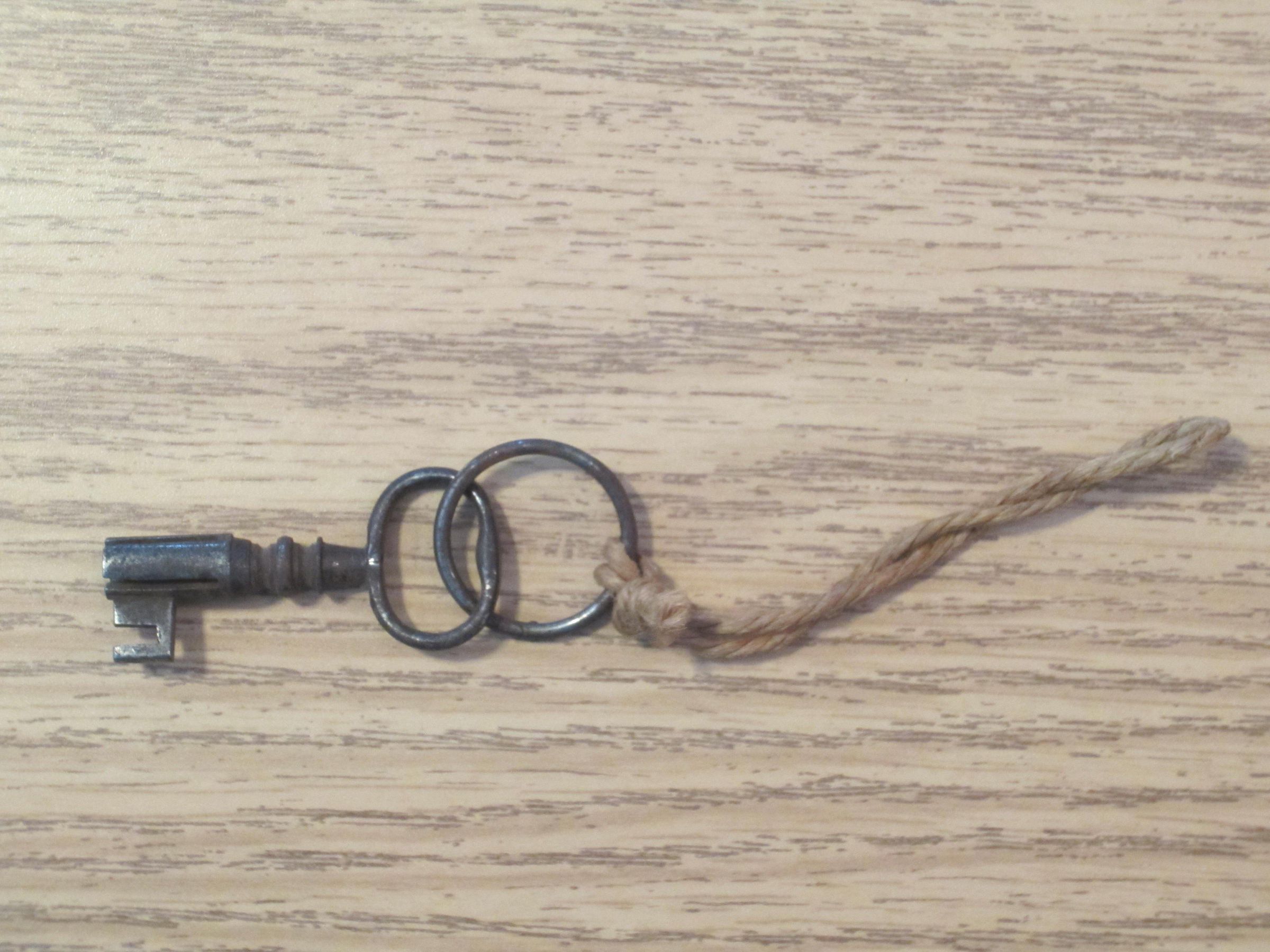 Key to lock on Boardman Document Trunk, 1.75" long, secured with ring and cord.