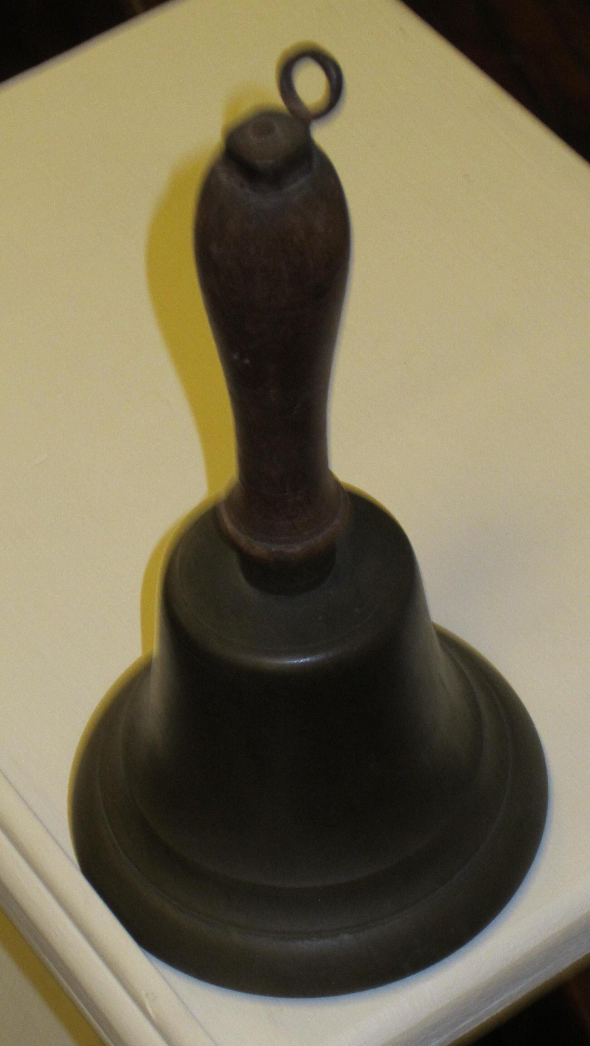 7 3/4 inches x 4 inches (diameter base of bell). Bell has wooden handle 3 1/2 inches long, with squared metal nut at top. Also a metal screw eye set into handle top, to one side.