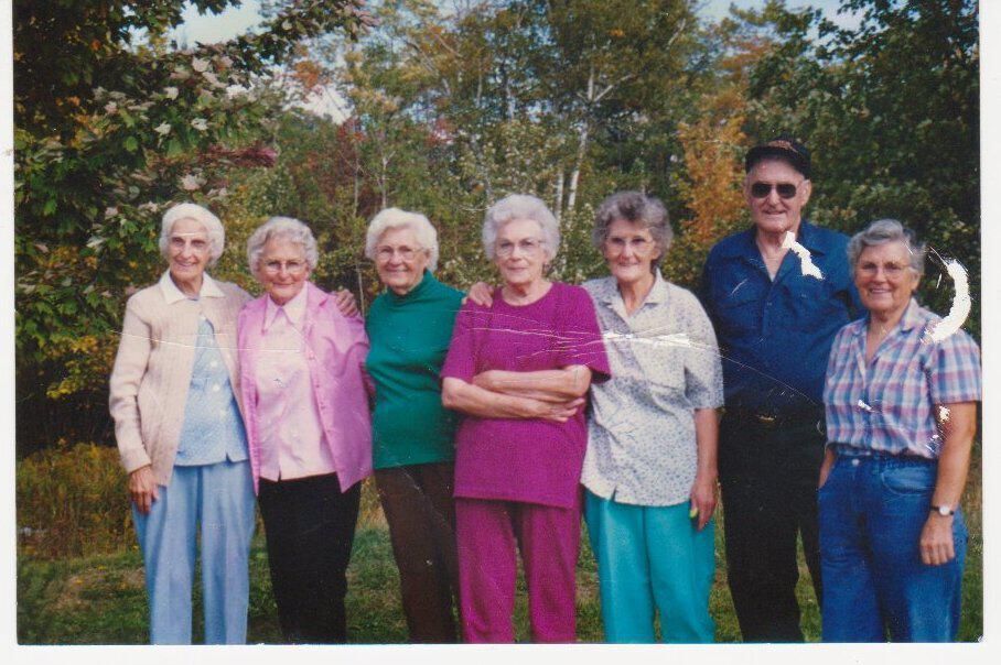 15 snapshots of groups of Coombses and Rolersons, connected by Lydia Coombs Rolerson (Mrs Clyde). This picture shown at lower right has L_R the siblings Ruth Sprague, June Hall, Lydia Rolerson, Dorothy McNeil, Marjorie Hatch, Henry Coombs, Marie Hall. Missing are Katheline Molumphy, Merriel (sp?) Coombs, Priscilla Coombs.