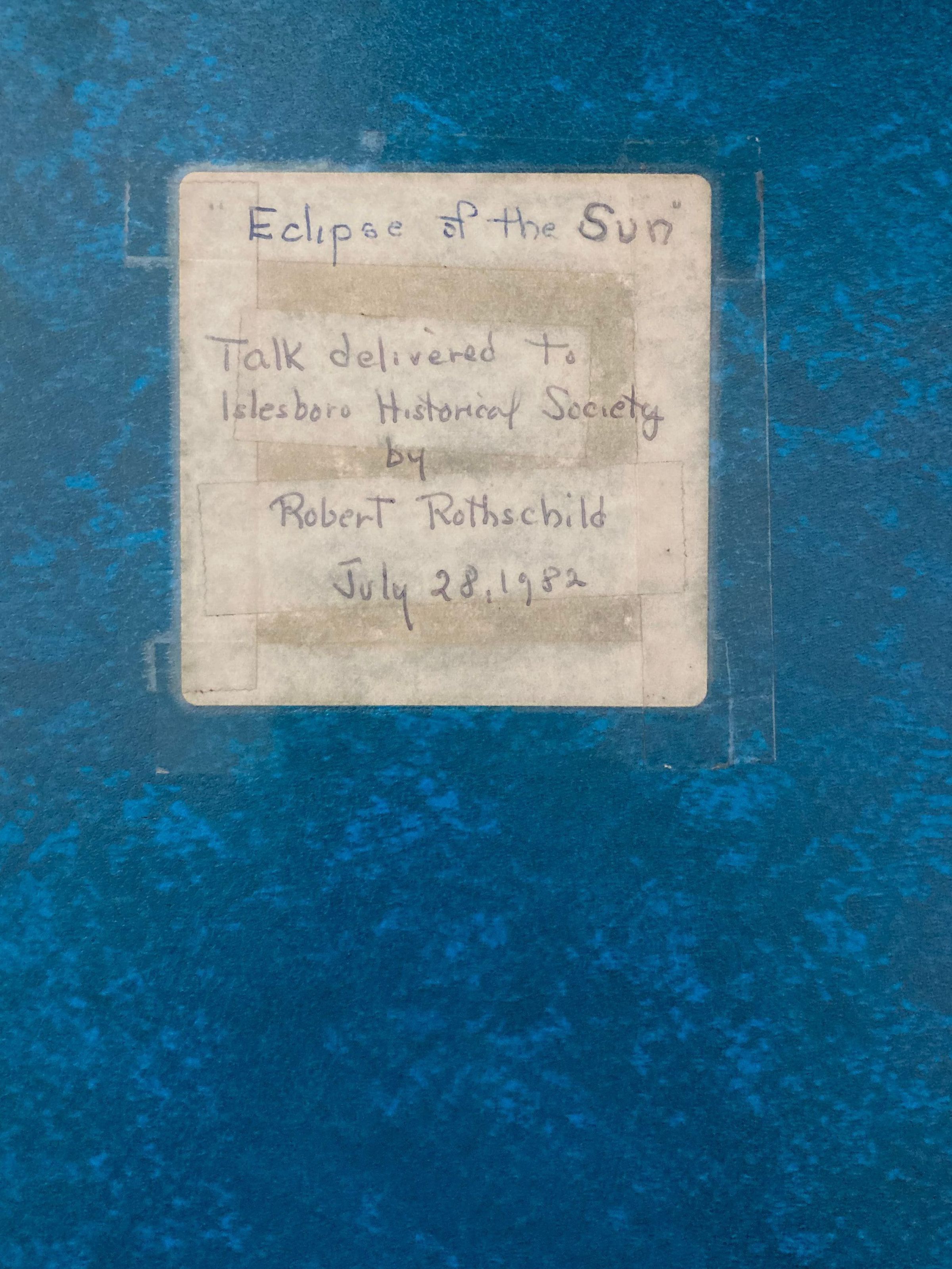 "Eclipse of the Sun," by Robert Rothschild. A talk delivered to the Islesboro Historical Society, July 28, 1982