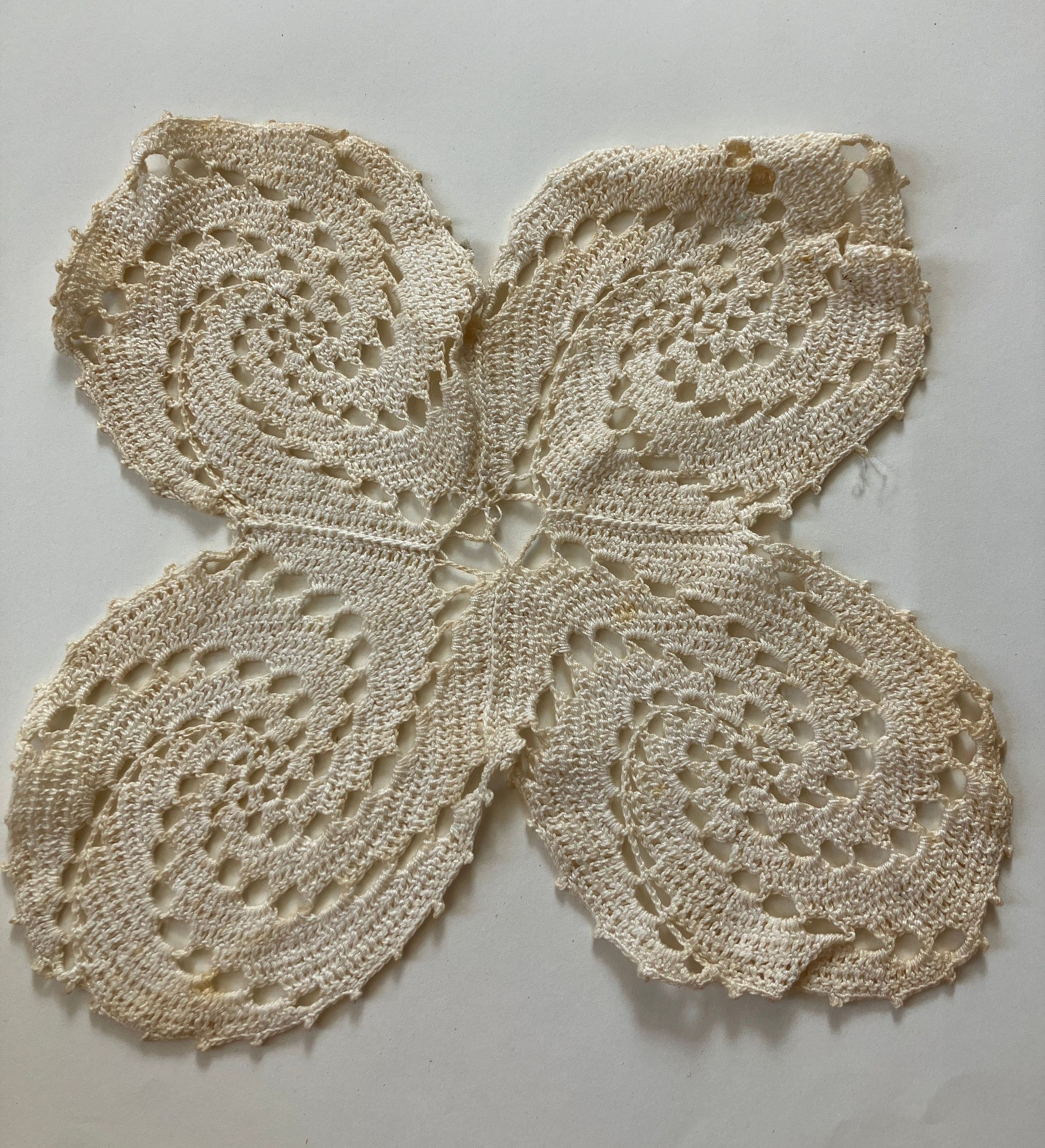 White crocheted four lobed doily with swirl pattern. From lobe to lobe, 11 1/2 inches, between lobes 4 1.2 inches. Medium-fine crochet thread, cotton.
