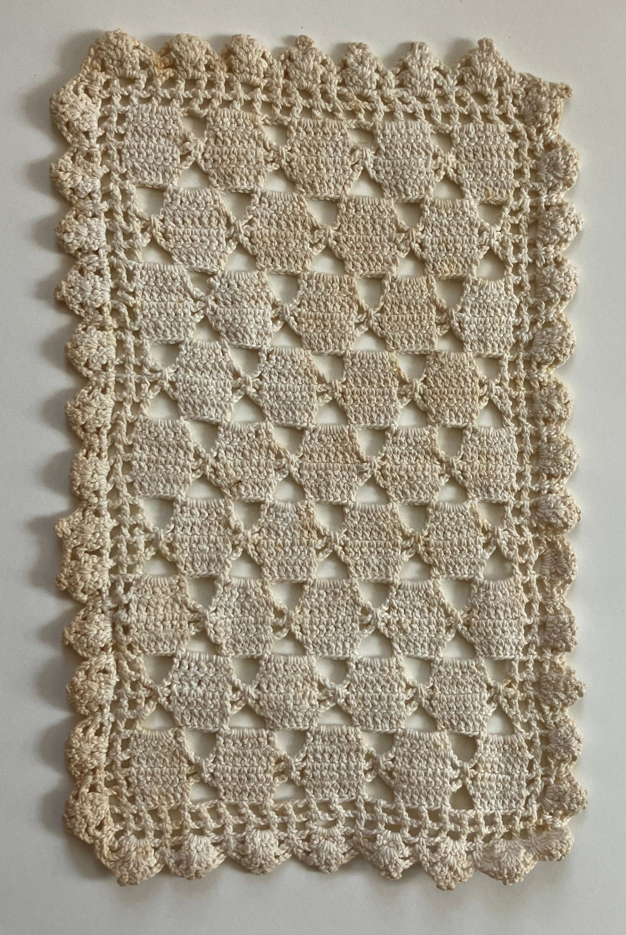 12 1/2 inches x 17 3/4 inches. White, crocheted, rectangular doily or small placemat with scalloped edges, in heavy cotton thread.