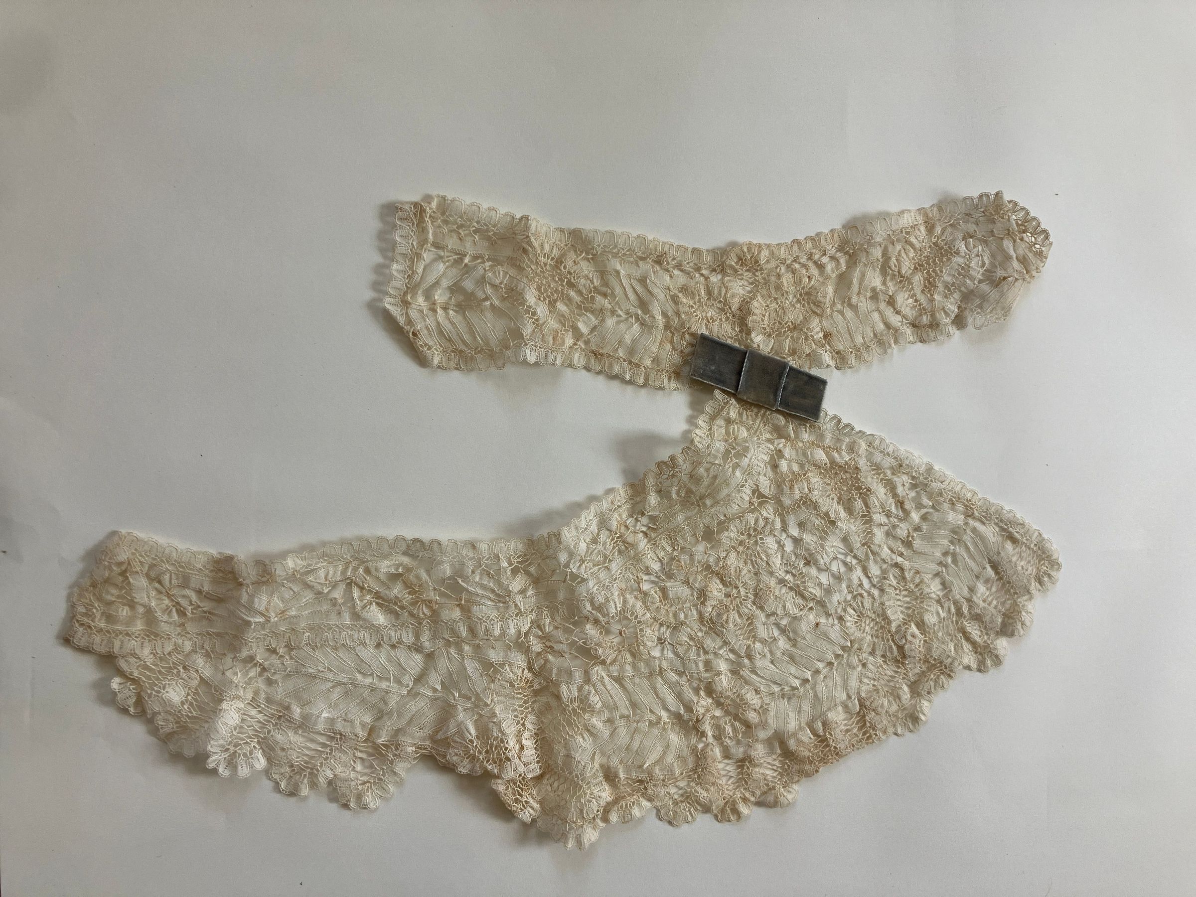 The partial collar is made of white lace in two pieces with faded blue velvet ribbon, sewn together. One piece is triangular - 19 3/4 inches from end to end. Short edge is 8 1/2 inches. Rectangular piece is 14 inches x 2 5/8 inches. Very fine thread in bobbin or Battenburg lace.