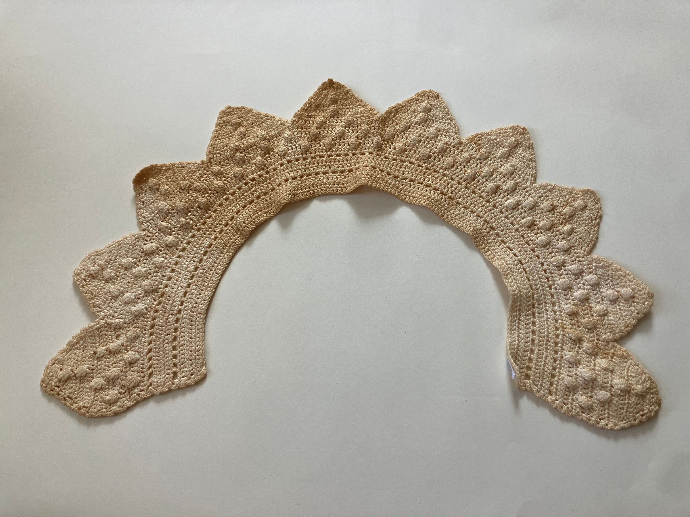 Inner edge 19 1/4 inches, inner edge to scalloped edge, 4 inches. Crocheted collar has 10 pointed scallops on outer edge, crochetted with heavy cotton thread in popciorn stitch. Yellow and spotted in places.