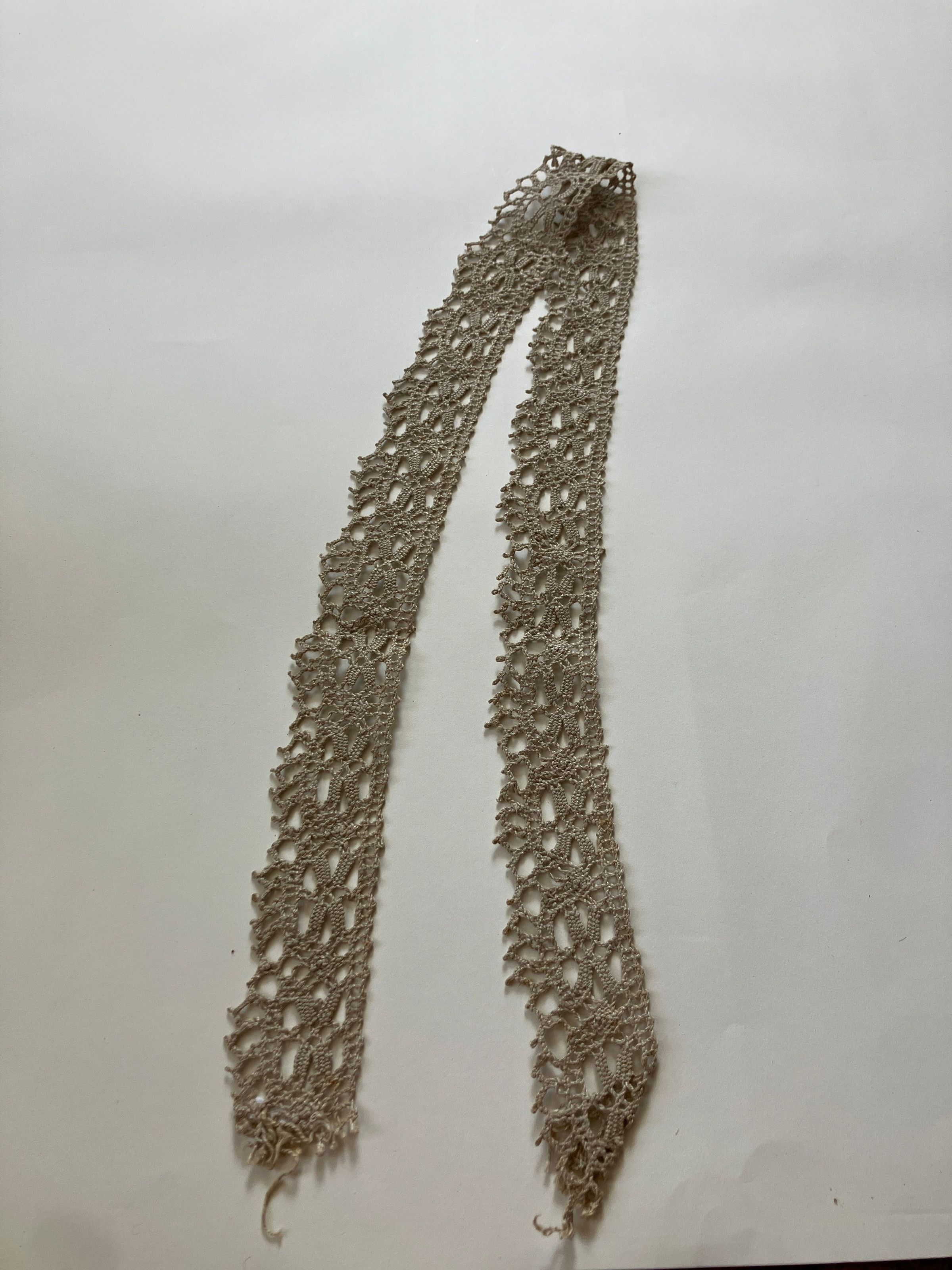 Lace measures 39 1/2 inches x 1 3/4 inches. Lace strip of grayish-white thread. Bobbin lace in linen or cotton thread, flax color.
