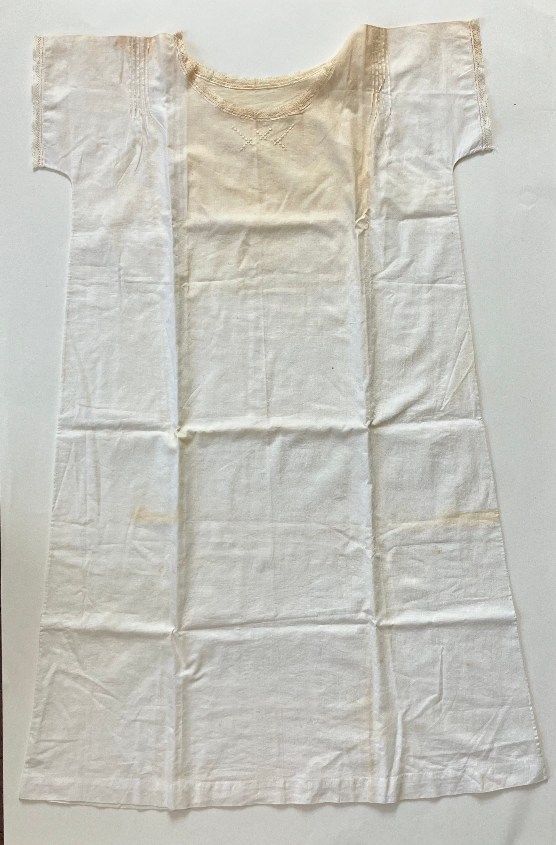 Center front 30 7/8 inches, width at hem 23 1/2 inches, across shoulder, 19 3/4 inches. Neck and short sleeves trimmed with lace. Five small tucks on each side of center front and back. Three off-center designs embroidered on front, center.