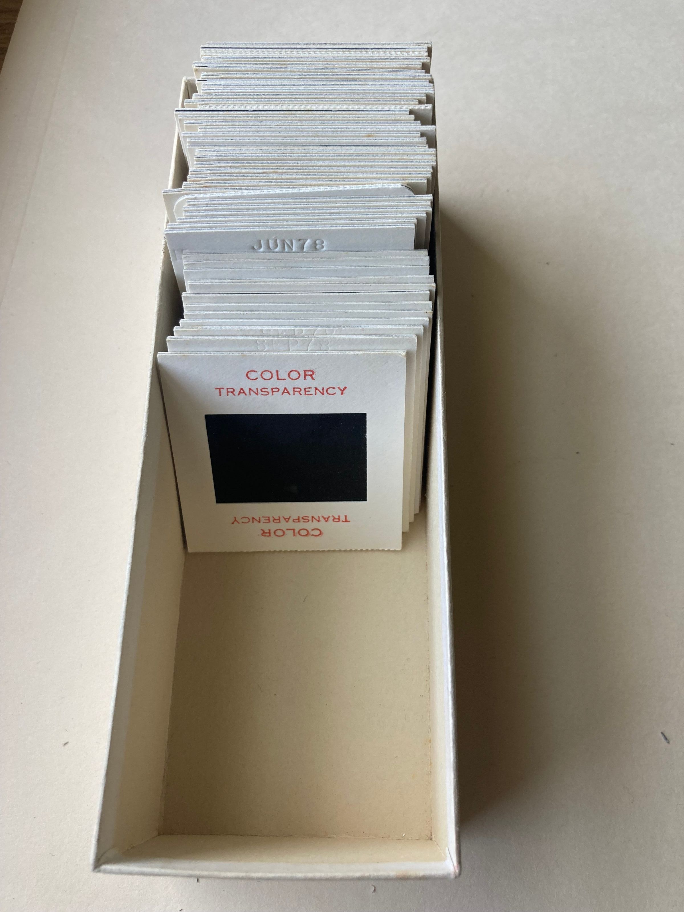 Box of slides developed from photographs taken by Dorothy Pendleton. Subjects include a ceremony outside the ALP Library, presumably on Memorial Day, as the slides were developed in June 1978; scenic slides developed November 1984; other scenes for which date of development is unclear (possibly October 1978); a few photographs of islanders.