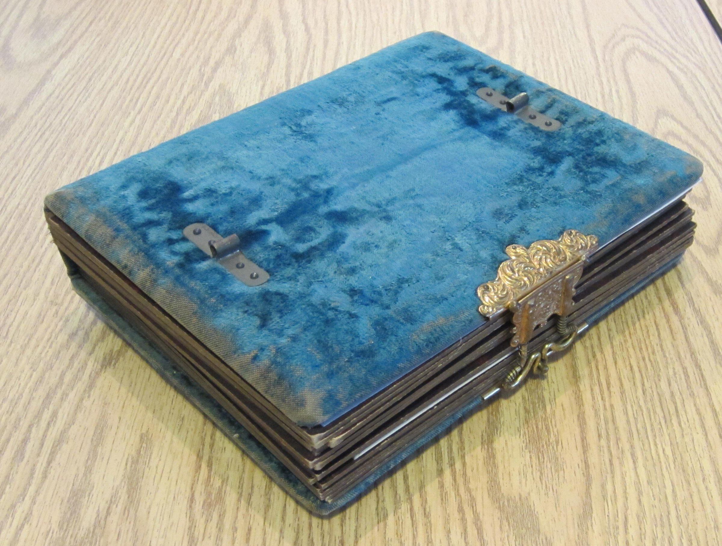 Large 9x12x3" album with gilt clasp, 18 heavy cardboard pages with some pictures, few identified. Front cover ornament reads "Our Friends," only fittings remain on back cover. Photography studio names indicate that most if not all all off-island and scattered throughout the US. Covered with blue/teal velvet once quite handsome. A 1892 remembrance card for Frances B Duncan (nee Frances R French) names this album.