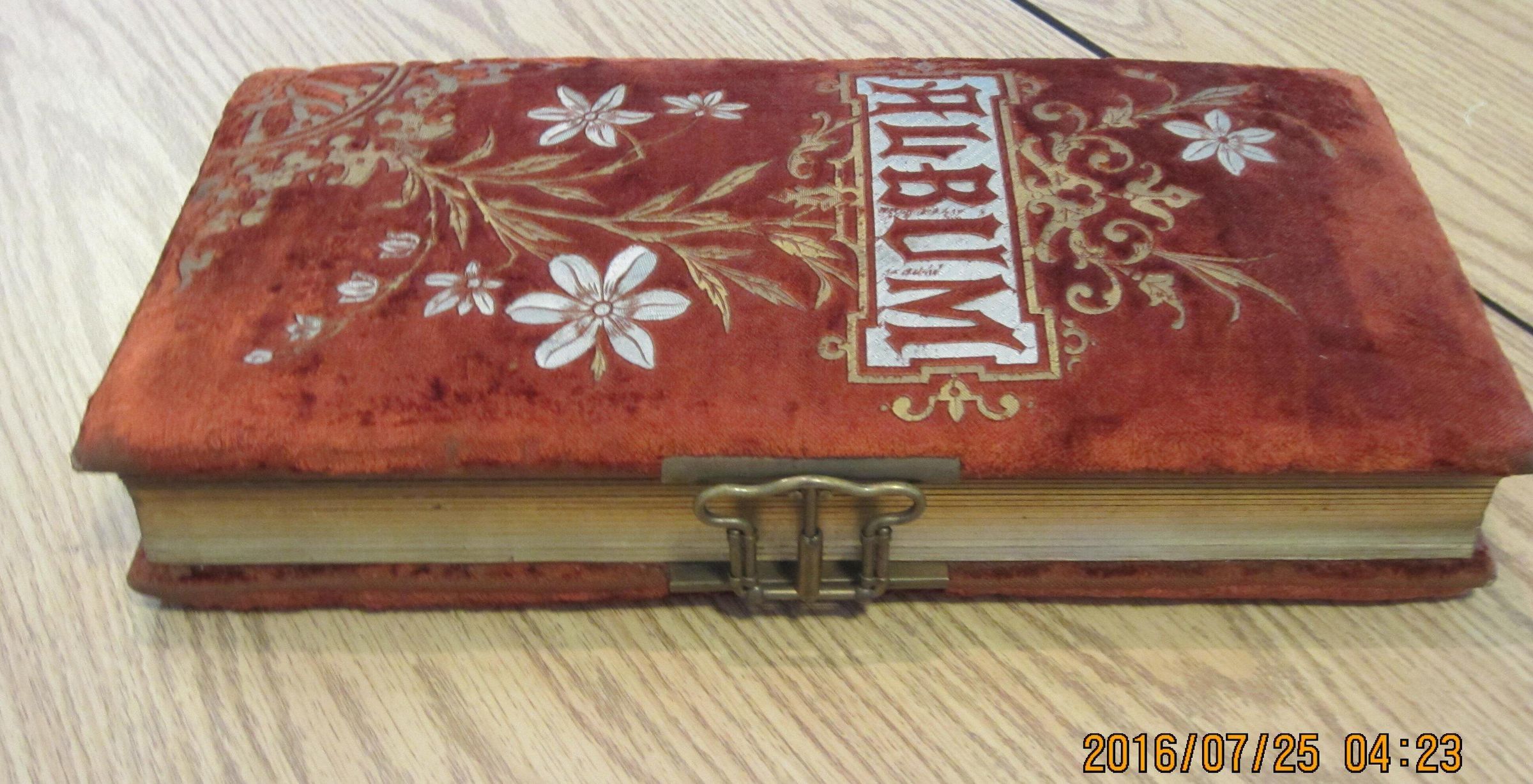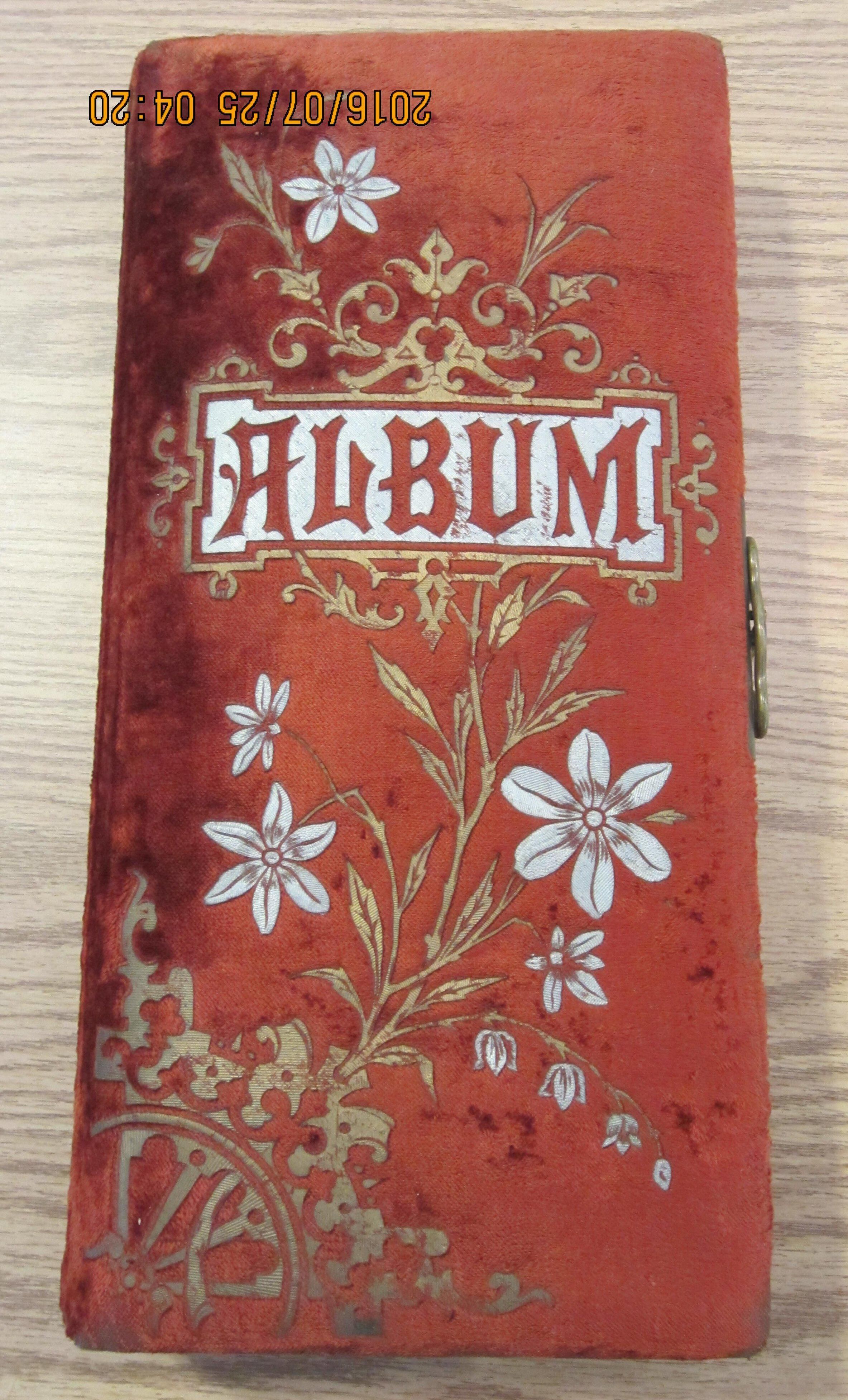 Album of unidentified studio photos, Handsome case. Related to Trim/Duncan families. 8" x 16" x 2.75". Fancy velvet cover, 16 heavy cardboard pages each fitted for 4 studio portraits. Most by studios in Maine, none identified.