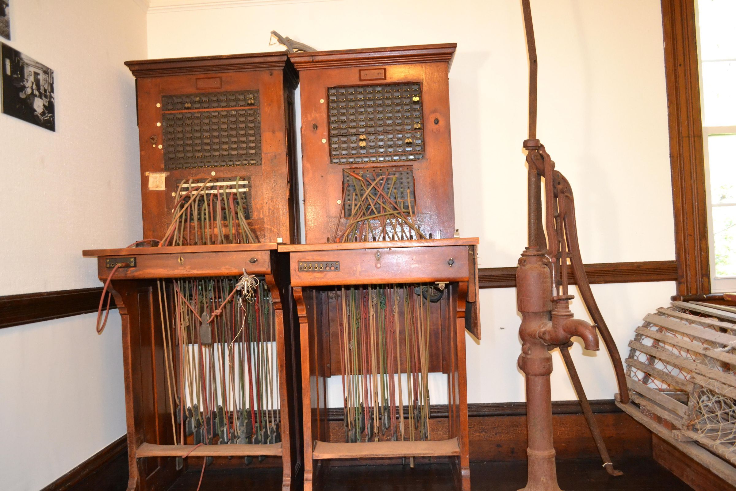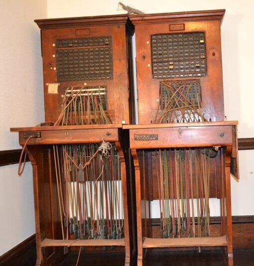 Wooden structure 24 3/4 inches w. x 26 inches d. x 66 inches h. Magneto Switchboard. Base to counter-top measures 37 inches high, is open from front to back with sides supporting countertop. A section measuring 22 1/4 inches x 11 inches x 29 inches sets back 15 inches from front of counter, has two vertical banks, the upper with 112 numbered drops and the lower with 100 jacks. Three 5/8 inch white plugs are on left of banks, top numbered 1; 2nd and 3rd, zero. The back of set-back contains telephone wires. In front of the vertical banks are two rows of cords having 12 cords with 1 3/8 inch metal tips, in each row. The 50 inch cords are attached to weights with a pulley section on top, all weights having 119 impressed on them. The weighted ends hang down in the open section of the base. A 1 inch high footrest is affixed between the sides of the base, 8 inches from the floor. Twelve toggle switches, which move in one direction only, are 6 1/2 inches from front of switchboard. All switches are black except the 2nd from left which is red. Between the toggles and cords are 12 3/8 inch white plugs flush with base, numbered 1 - 12.