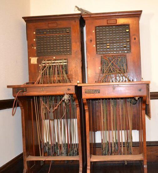 Wooden structure 25 inches w. x 26 inches d. x 66 inches h. Magneto Switchboard. Base to countertop measures 37 inches high, is open from front to back with sides supporting countertop. A section measuring 22 3/4 inches x 11 inches x 29 inches sets back 15 inches from front of counter, has two vertical banks, the upper with 102 numbered drops and the lower with 90 jacks. To the left of drops section are three 3/8 inch white plugs; one marked TO, one blank, one zero. To the left of the zero plug is a 3/8 inch white plug lettered "A" which is below an immovable toggle. Above jack section is one 5/8 inch white plug numbered zero. To the left of jack section are two plugs, the top one lettered TO and the other, zero. A strip of paper is attached below the first row of jacks and is lined into 1 inch blocks numbered 1-10. Above #6 the word BELFAST is printed. A like strip is attached below the 2nd row of jacks and is without numbers. In the 3rd from right block TEST BD is printed. In front of the vertical banks are two rows of cords each having 13 cords, with 1 3/8 inch metal tips. The 50 inch cords are attached to weights with a pulley section on top, all weights having the number 119 impressed on them. The weighted ends hang down in the open section of the base. A 1 inch high footrest is affixed between the sides of the base, 8 inches from floor. Twelve toggle switches, which move in one direction only, are 6 1/2 inches from front of switchboard. All switches are black except the 2nd from left which is red. Between the toggles and cords are 13 3/8 inch white plugs, flush with surface. The first at left is lettered A, others are numbered 1-12.