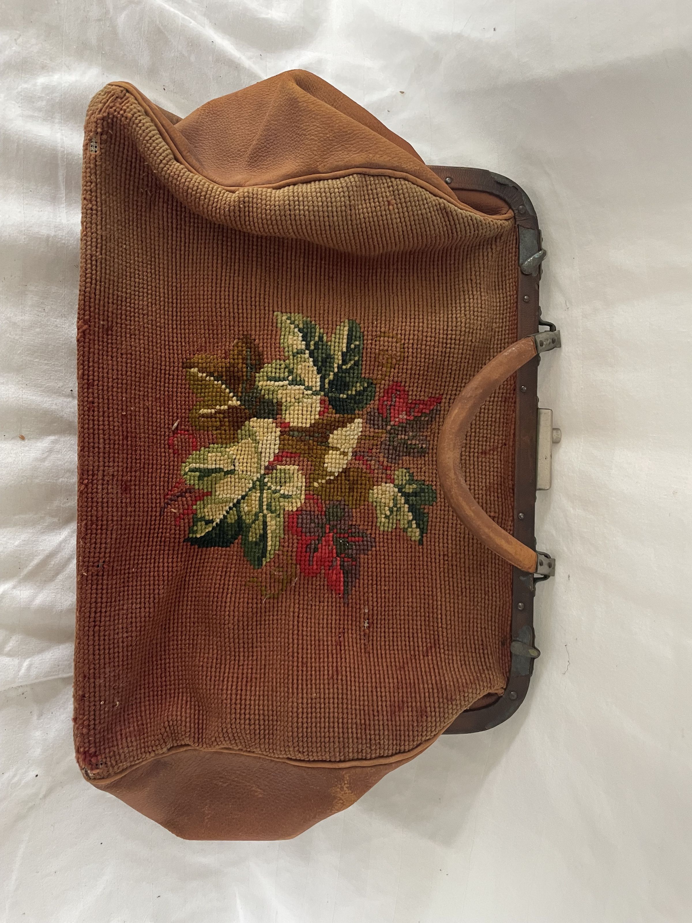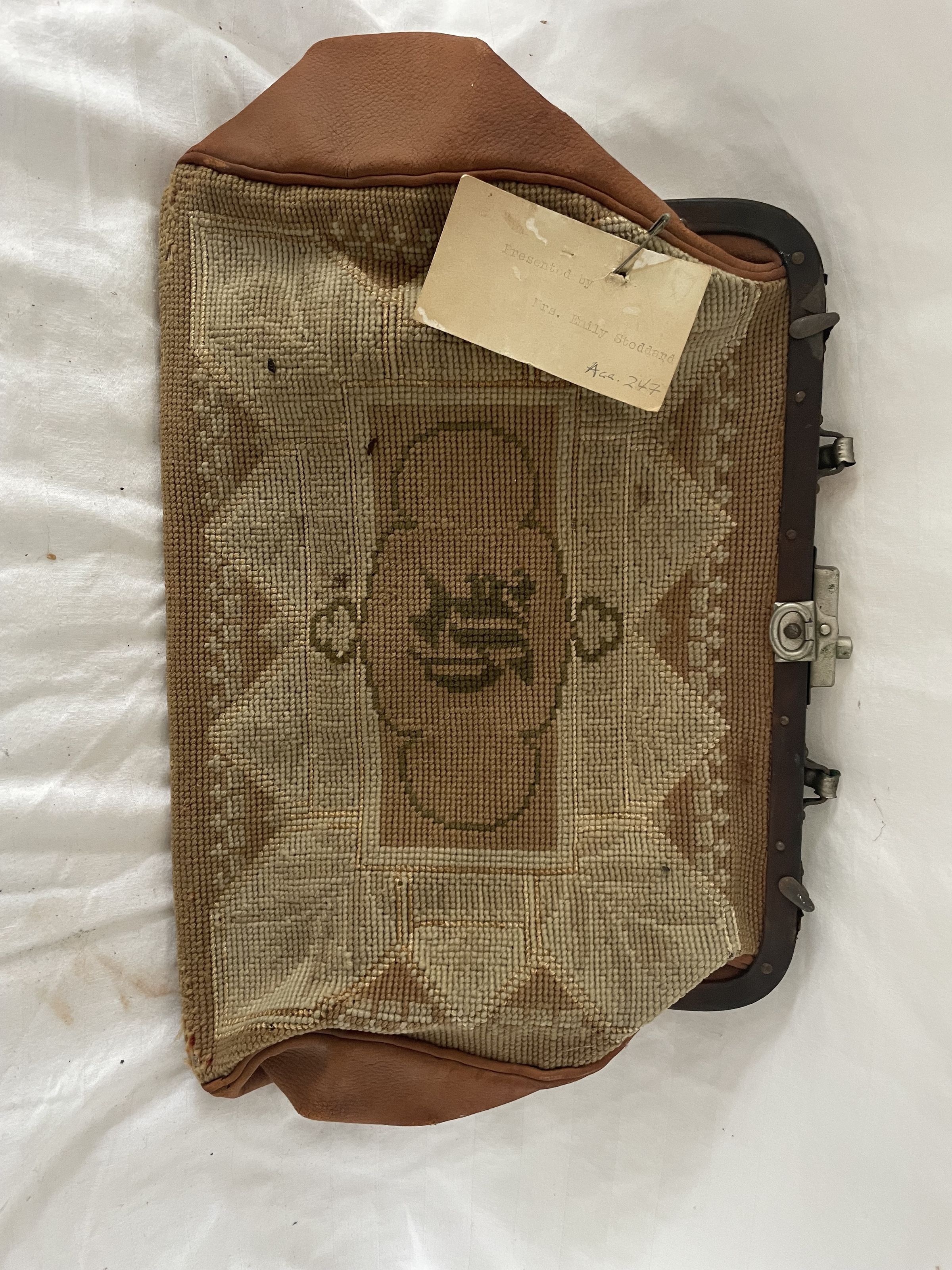 Presented by Mrs. Emily Storddard. A small brown handbag with a intricate needlepoint design of ivy leaves and a monogram that reads the initials: "LS".