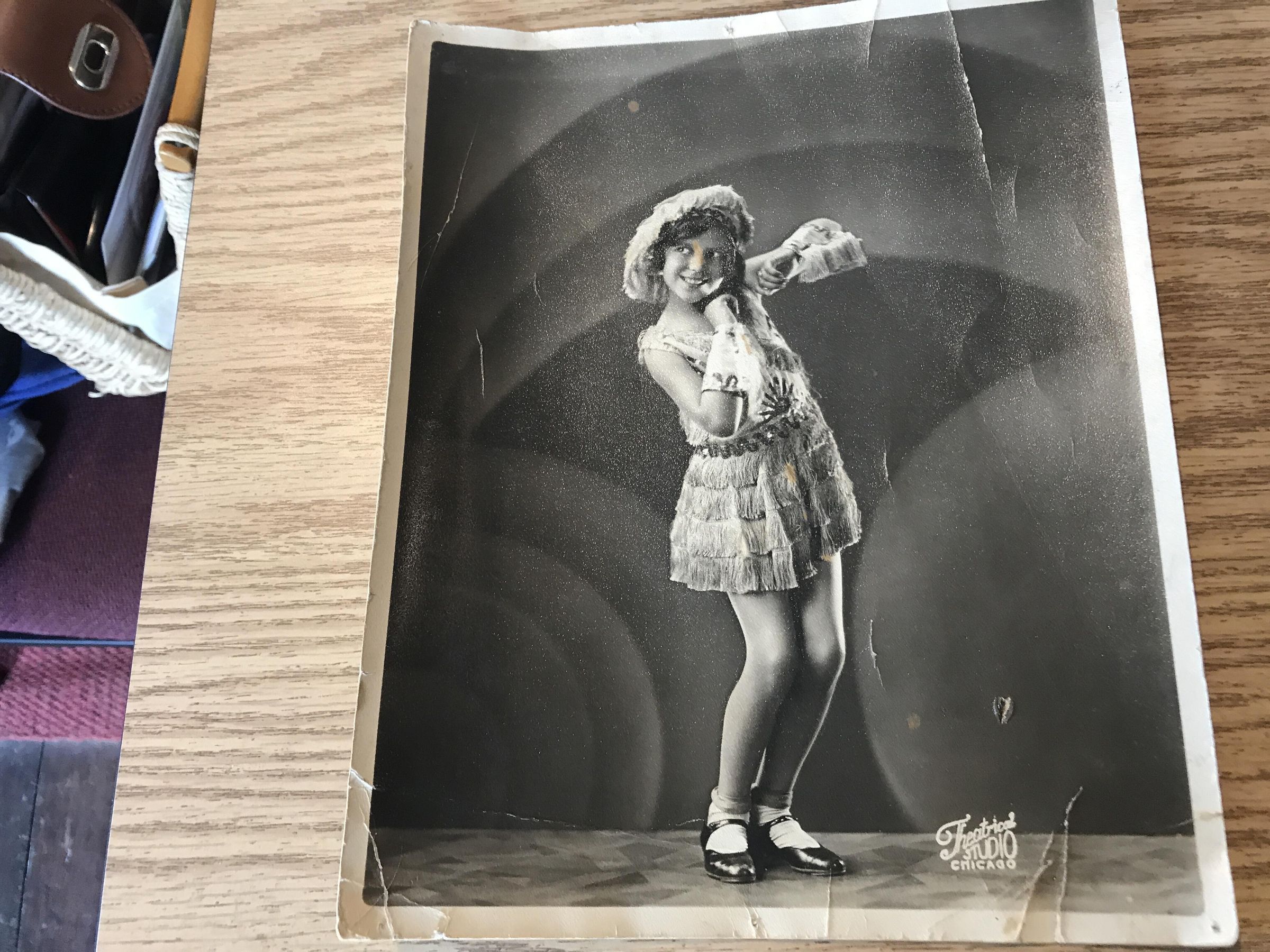 8x10 b/w photo taken by Theatrical Studio, Chicago: young girl in costume posing for ??? On back "To Elyn from your pal May". Found in the Ben Moody house, unframed.
