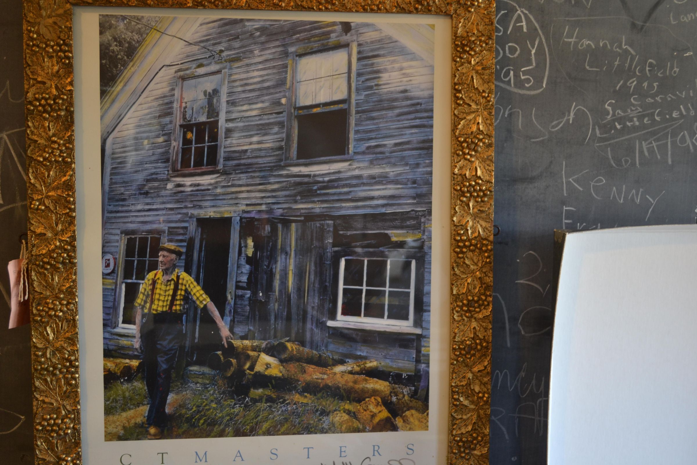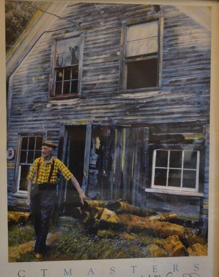 Poster made from a photo. Signed by Jack McConnell. Shows Robin Quimby standing in front of his shop.