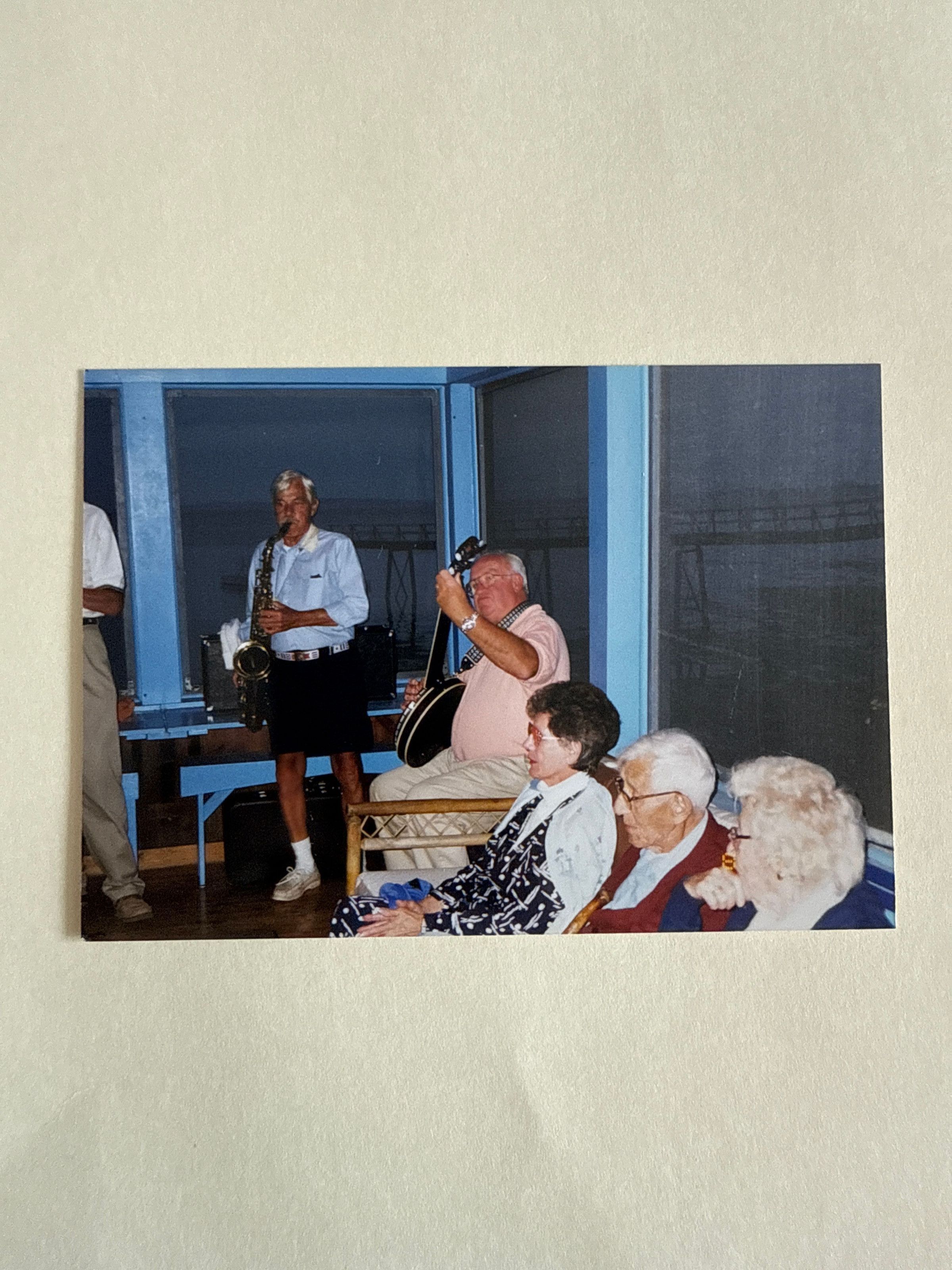 3x5 color photo of banjo player, John Mitchell, at a Charlie Pendleton "Dock Party"