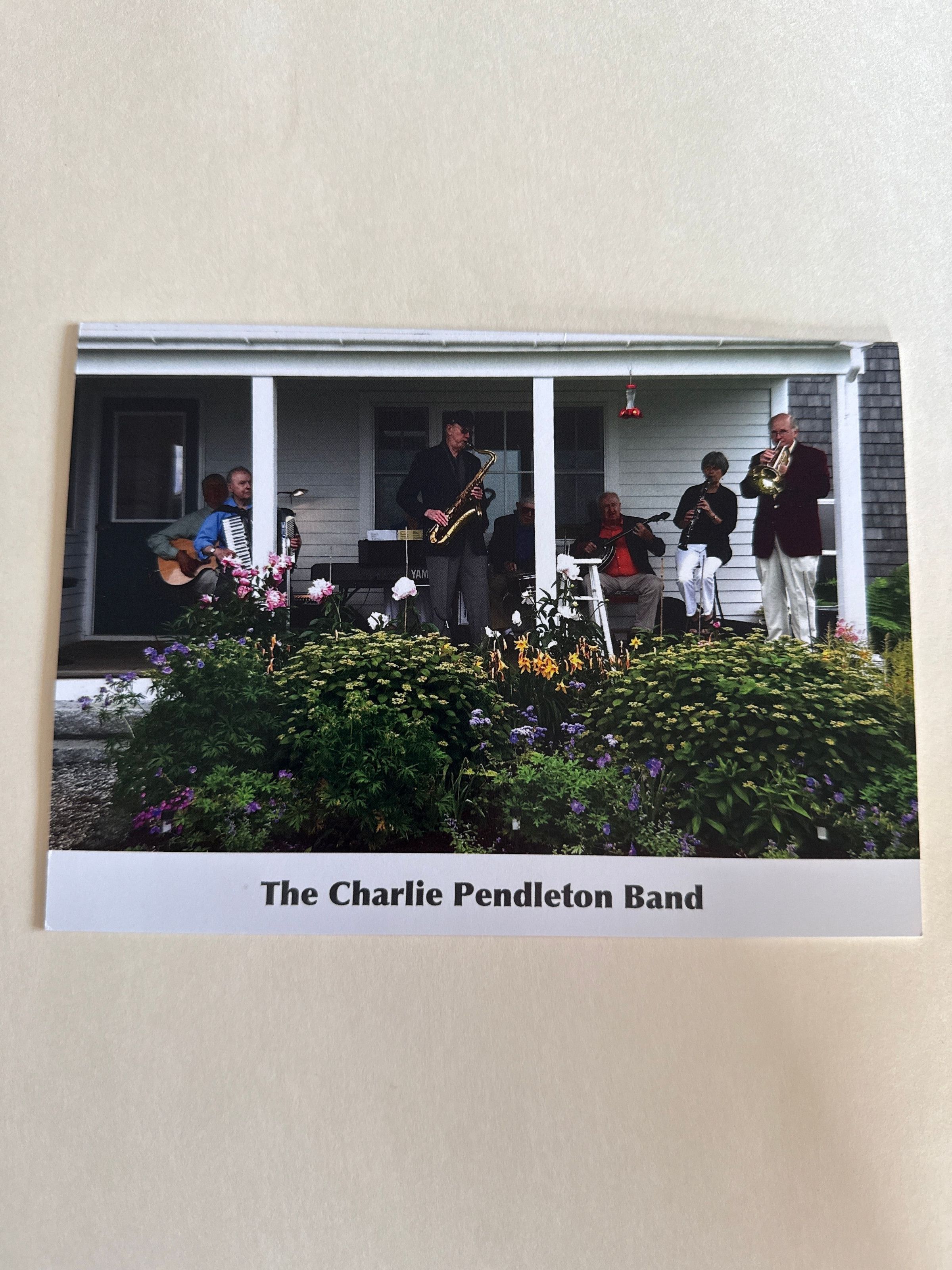 color photo of the Charlie Pendleton Band playing on a porch, made up as a greeting card by Margie and Peter Mills.