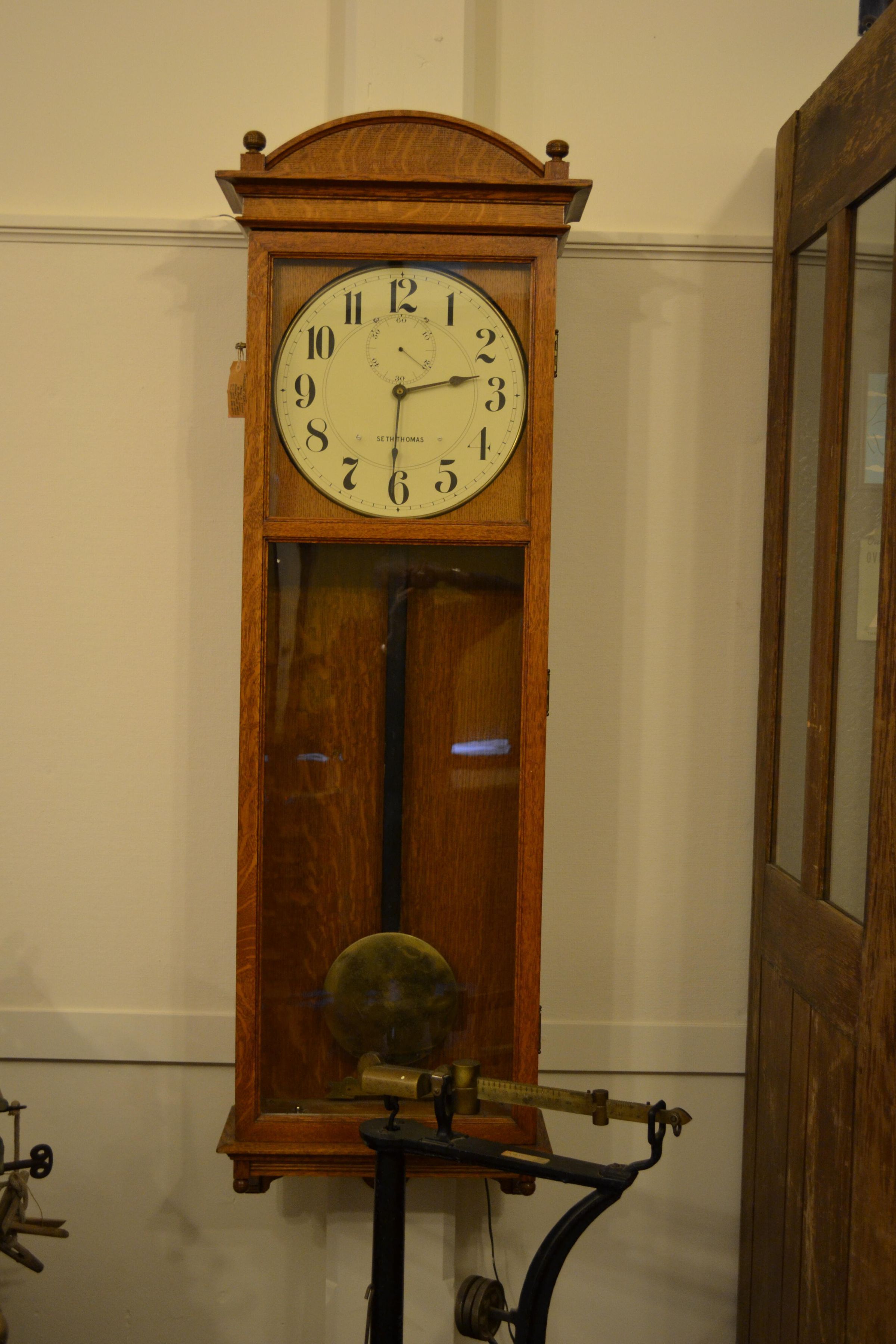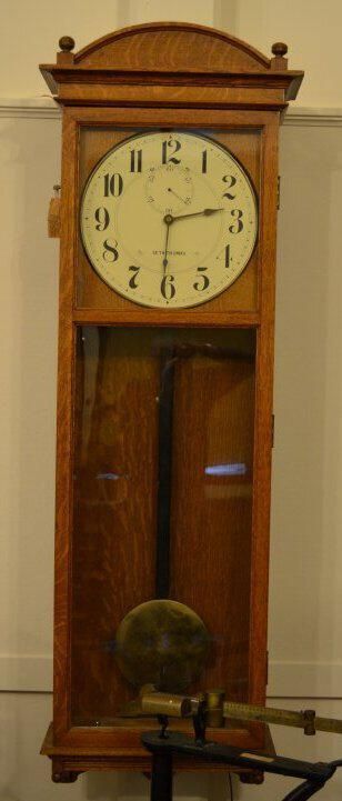 Wooden case 58 1/4 inches high x 16 7/8 inches wide x 7 1/2 inches deep. Front has glass cover in two sections: 1. 14 inches x 14 inches; 2. 14 inches x 31 3/4 inches. Behind glass at top is clock face, 14 inches in diameter. Lower section covers pendulum. Metal strip behind bottom of pendulum 7 1/2 inches long x 1 inch high inscribed with markings which mark the length of the swing of the pendulum. See also 1111.461.002