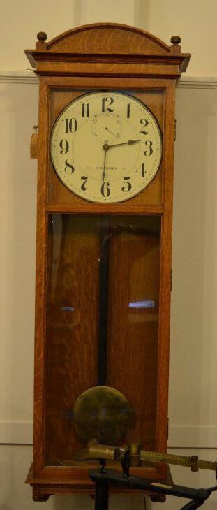 Large Seth Thomas clock housed in case described in 461.001. Face 14 inches in diameter with Arabic numerals and minute markings and a smaller face 4 inches in diameter underneath the numeral "12" with numerals for seconds, "10", "20",......."60". Pendulum is 26 inches long ending in a bob 7 3/4 inches in diameter. Original Inscription: On clock face: "Seth Thomas"