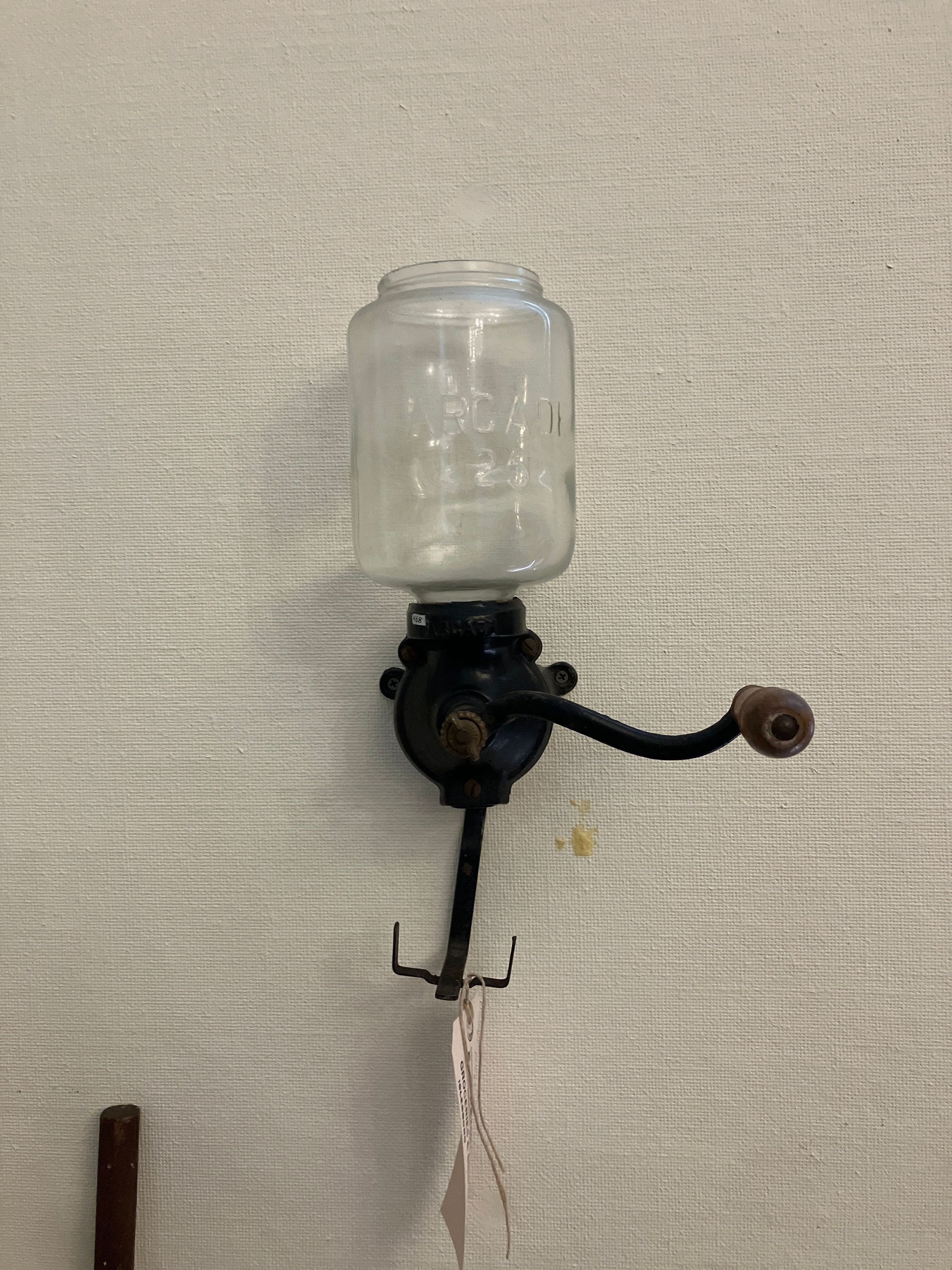 Overall height 15 3/4 inches Top is glass container 7 1/2 inches h. Top opening is 3 1/4 inches in diameter, lid is missing. Container fits into black metal mechanism with wooden handle for grinding contents. This piece has brackets attached for wall mounting. A section to hold a receptacle for receiving contents of mill is below the mill. Receptacle is missing.