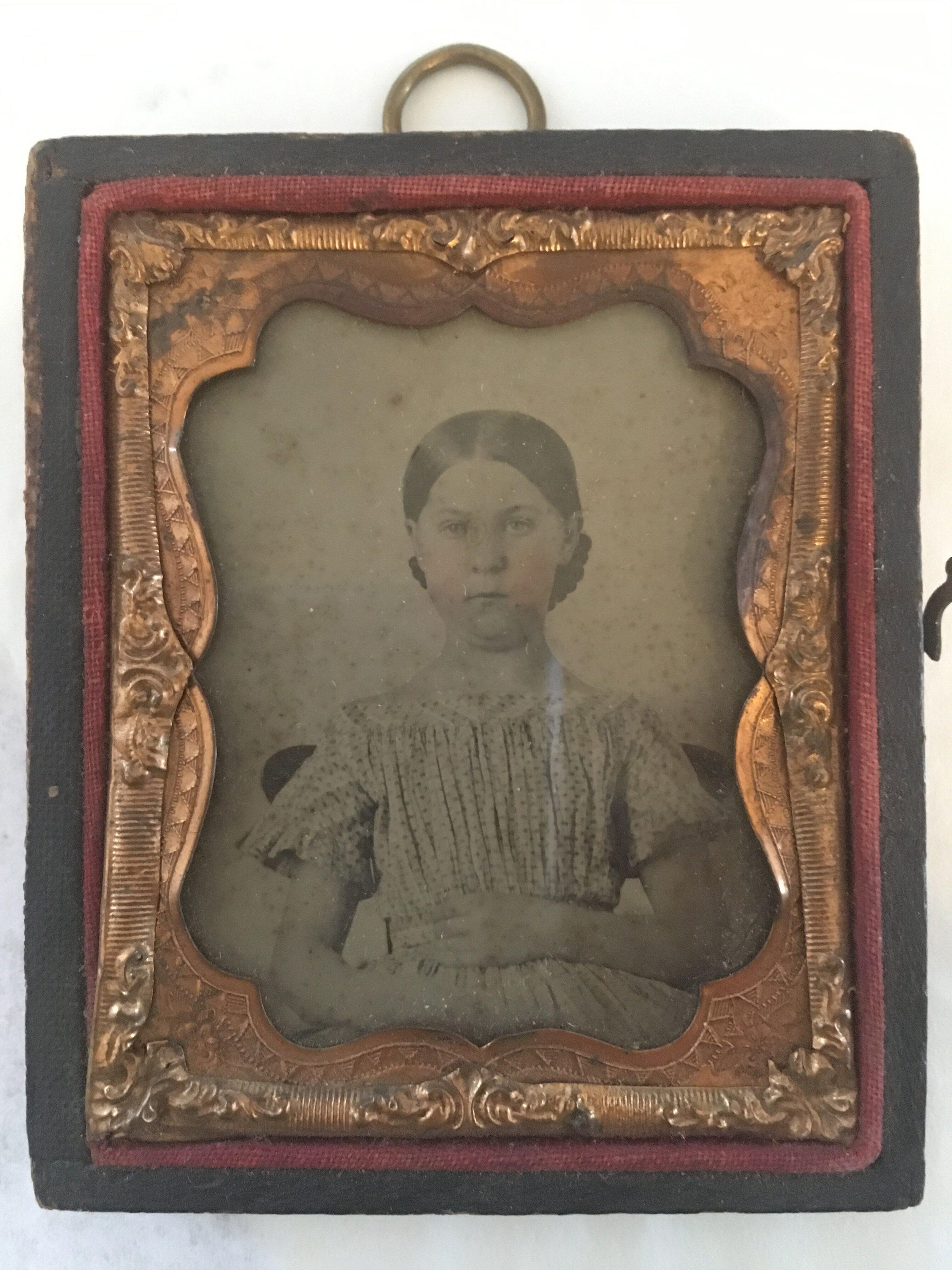 Image of a young girl in a copper-filigreed wooden frame. Front cover of frame is missing. Because of its weight, experts think photo is an ambrotype rather than a tintype (consulted William L. Schaeffer and Diana Hobart Dicus).