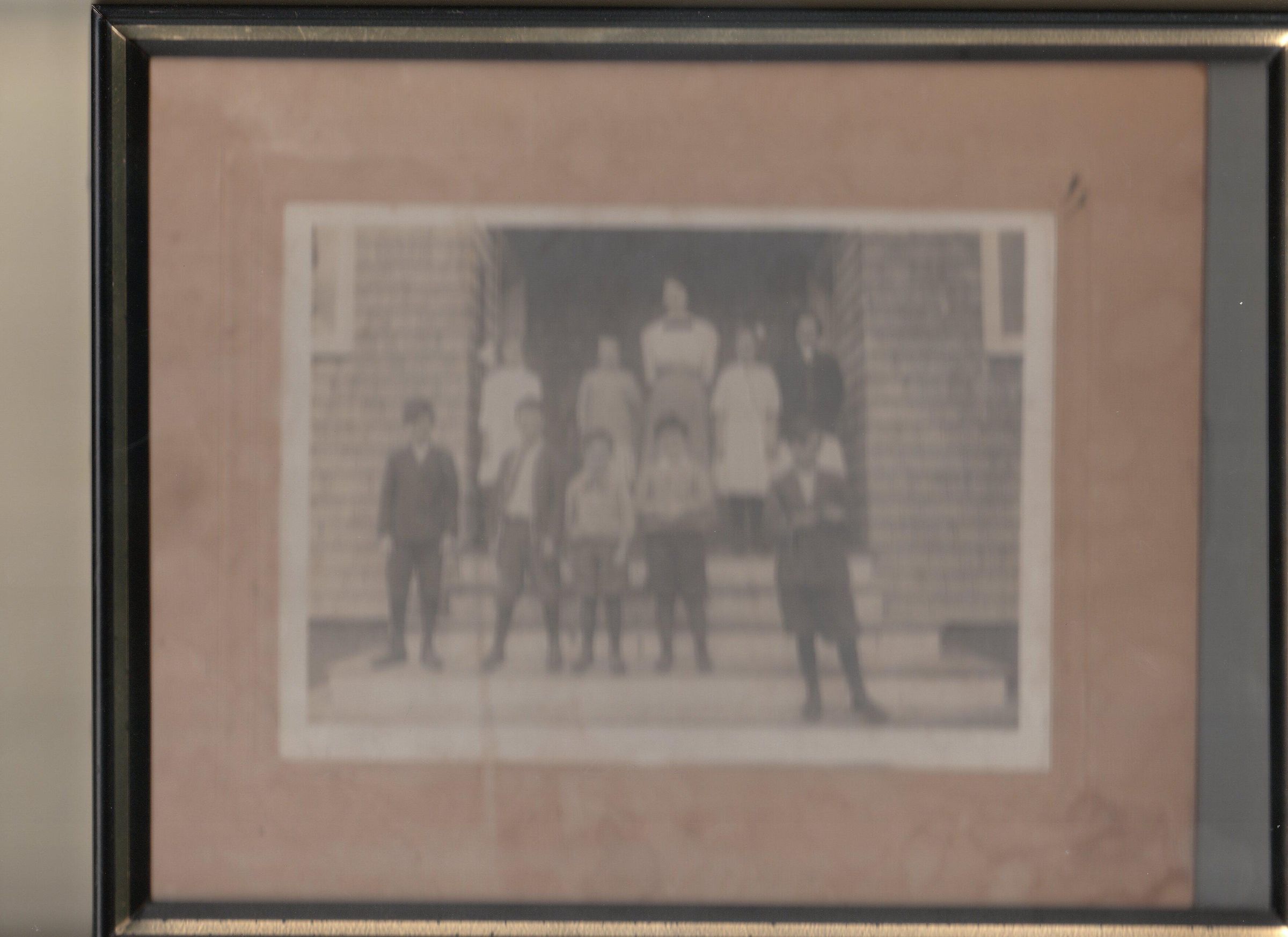 Framed photograph of schoolchildren and their teacher on the steps of the Dark Harbor School, now the Sewing Circle. Tentative identifications by John Mitchell.