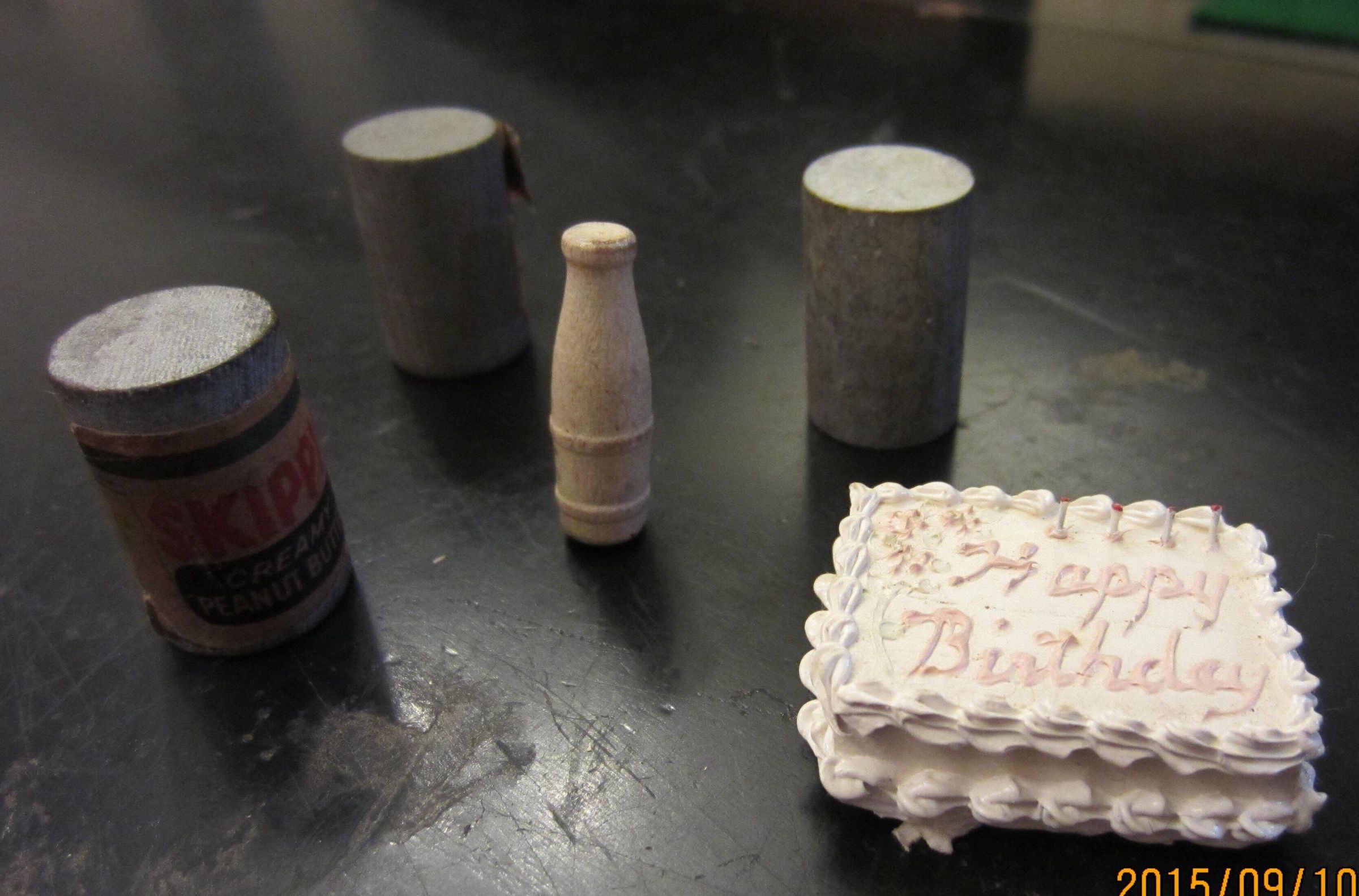 Assorted toy foodstuffs: beer cans, birthday cake, milk, peanut butter
