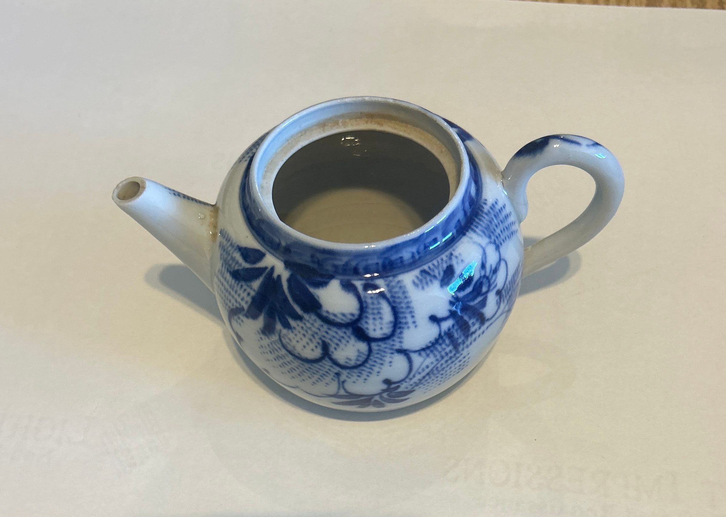 Small teapot measures approx. 3 1/2 inches high, with lid. Pouring spout is short. Teapot is white with blue decoration; leaves with blossoms.