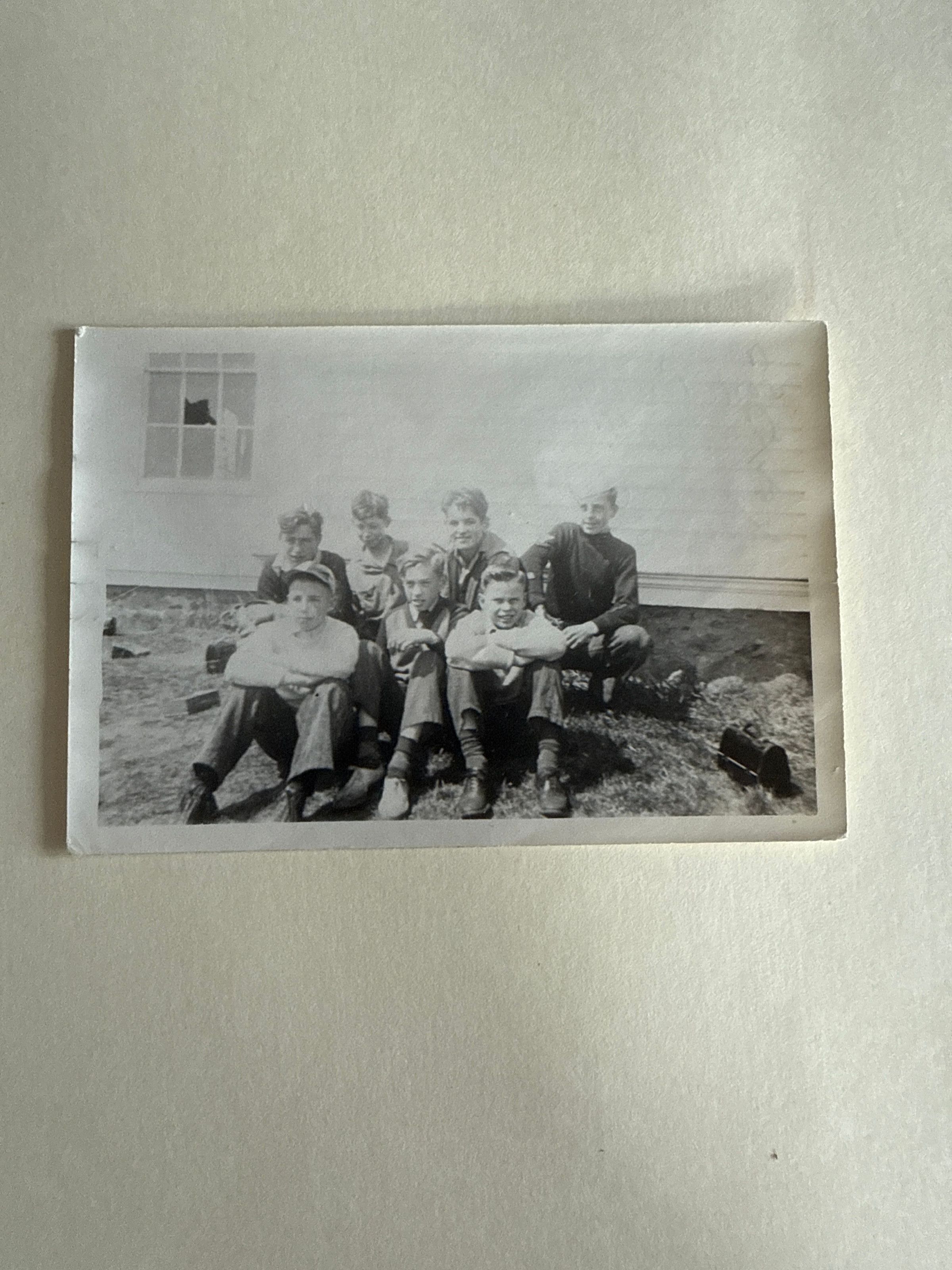 Islesboro schoolboys. Identified on verso: Earle Pendleton, Courtney Pendleton, Donald Knight, Leslie Lamont Rolerson, Jr., Buddy Bethune, Frank Hatch, Jack Leach. "Pendleton Primary School, Islesboro, Maine, In Guinea by God"