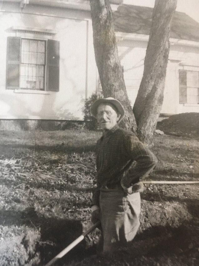 Informal photograph of Newell Trim, hand on hip and standing in a ditch he has just dug.