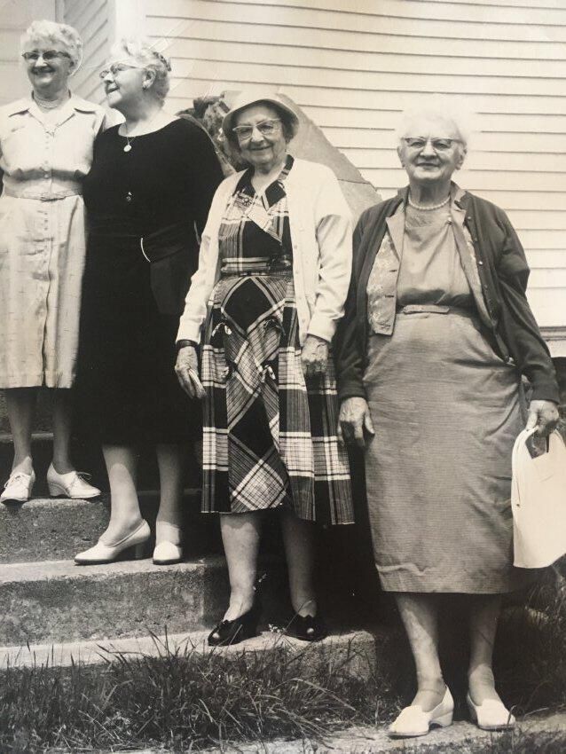 Group photograph of four women standing on what look like the steps of the Sewing Circle building. From their clothing, estimate date of early 1960s. Identified on verso from the top (or left to right): Irma Coombs, Marie Poulin, Leila Farnsworth, Mae Randlett.