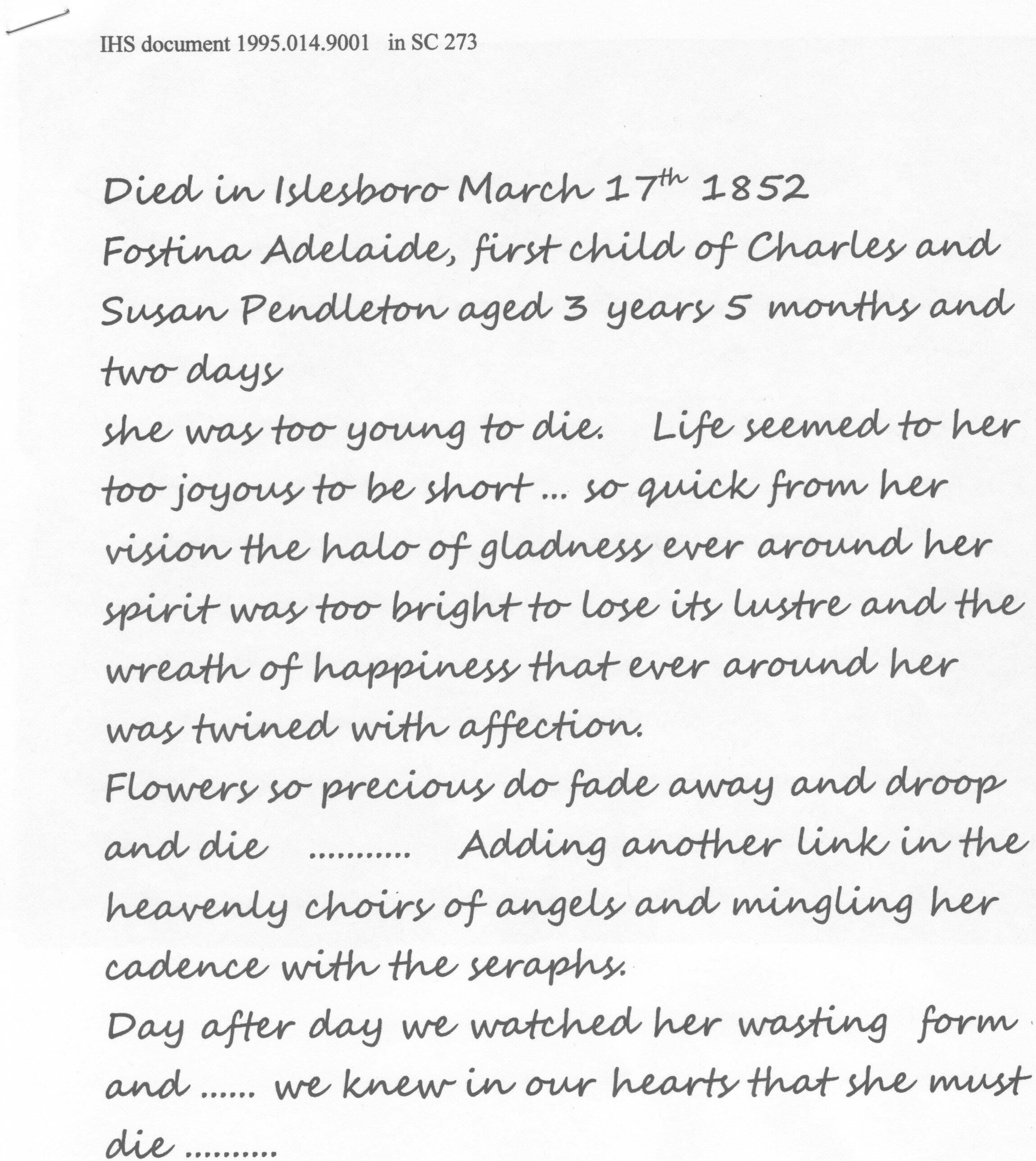 Transcript of a handwritten notice of the death of "Fostina Adelaide first child of Charles and Susan Pendleton aged 3 years 5 months and two days" in Islesboro, March 17th, 1851.