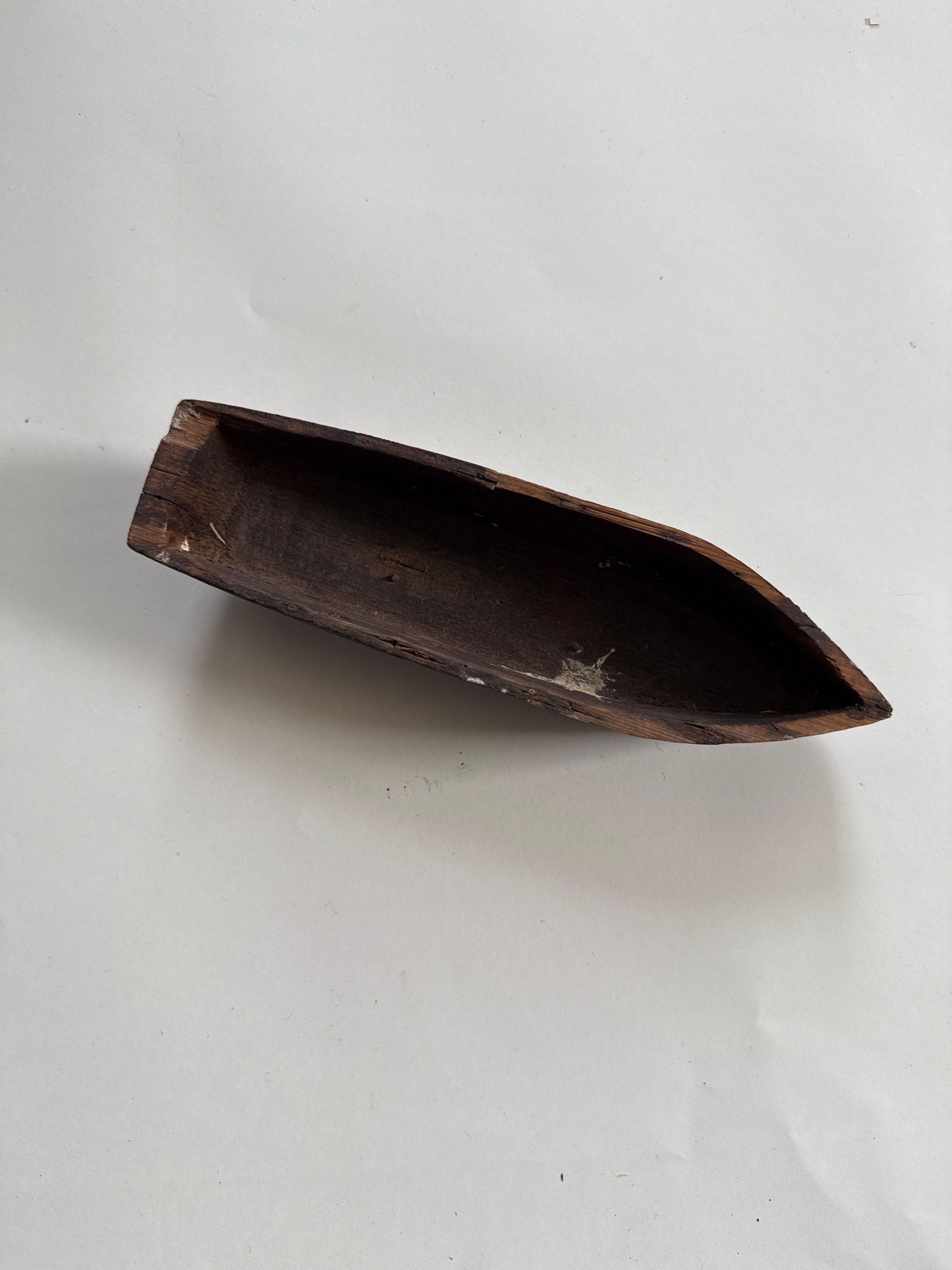 Wooden boat hull, 9 inches from bow to stern, whittled from one piece of wood stained brown. Has several spatters of white paint. Width at widest 2 1/2 inches. Piece of lead 3 3/8 inches x 1 1/4 inches nailed to bottom.