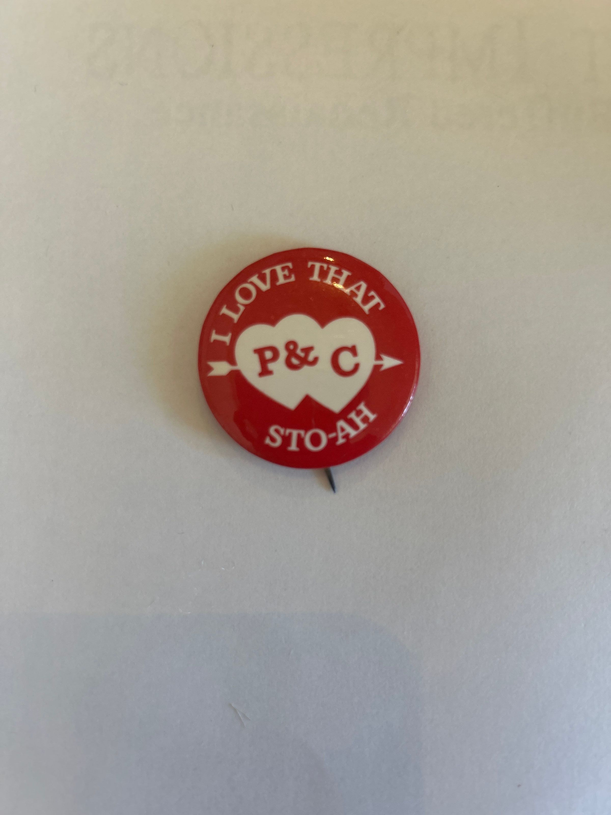 1 1/2 inch in diameter with white lettering around edge "I Love That Sto-ah". In the center are two white hearts with a white arrow entering and leaving the hearts. There is red lettering in the middle of the hearts "P & C".