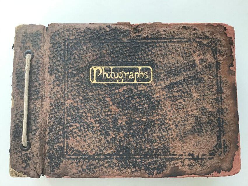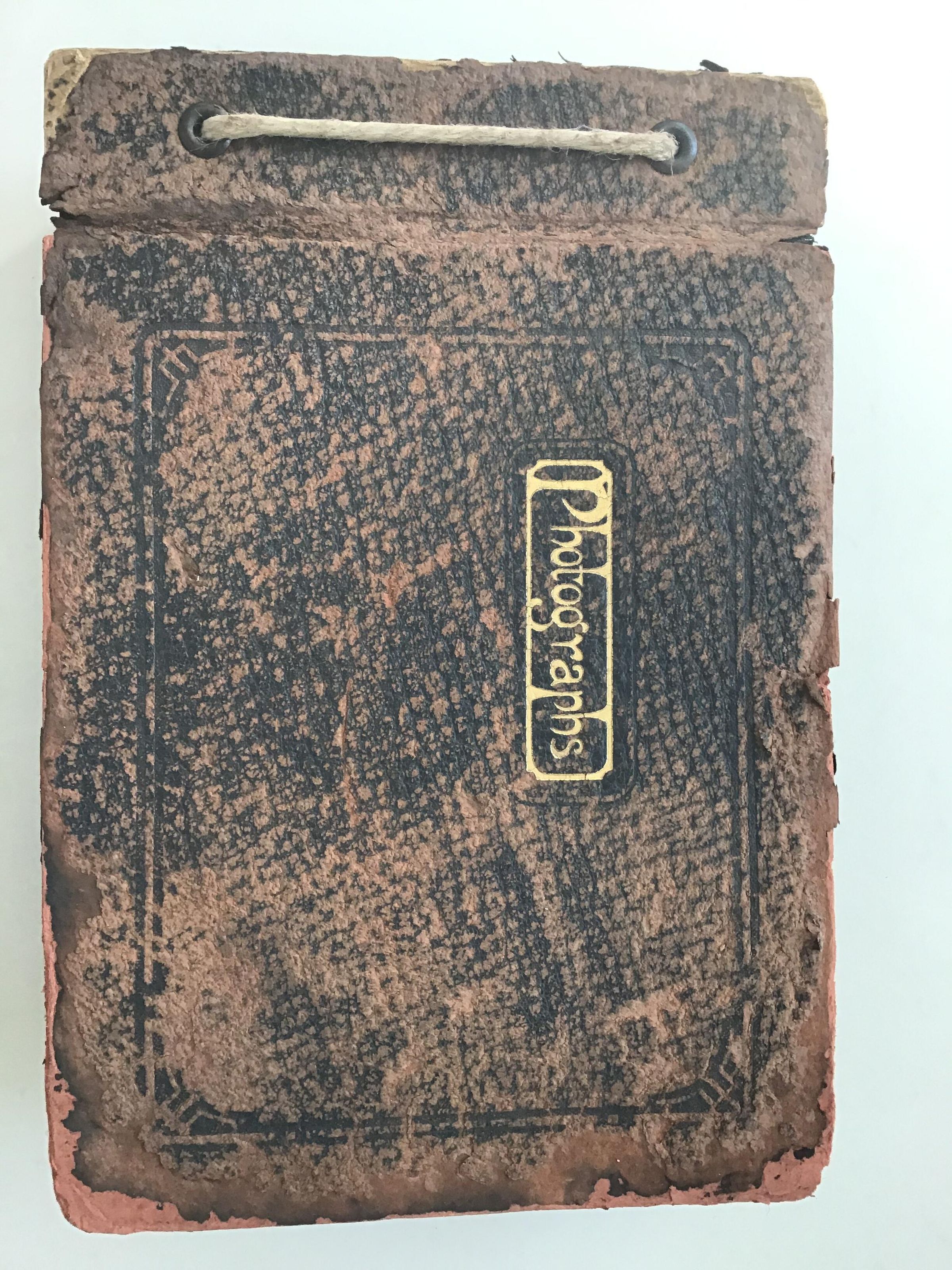 Pebbled leather flexiboards with string binding. Gilt stamped "Photographs" on cover.