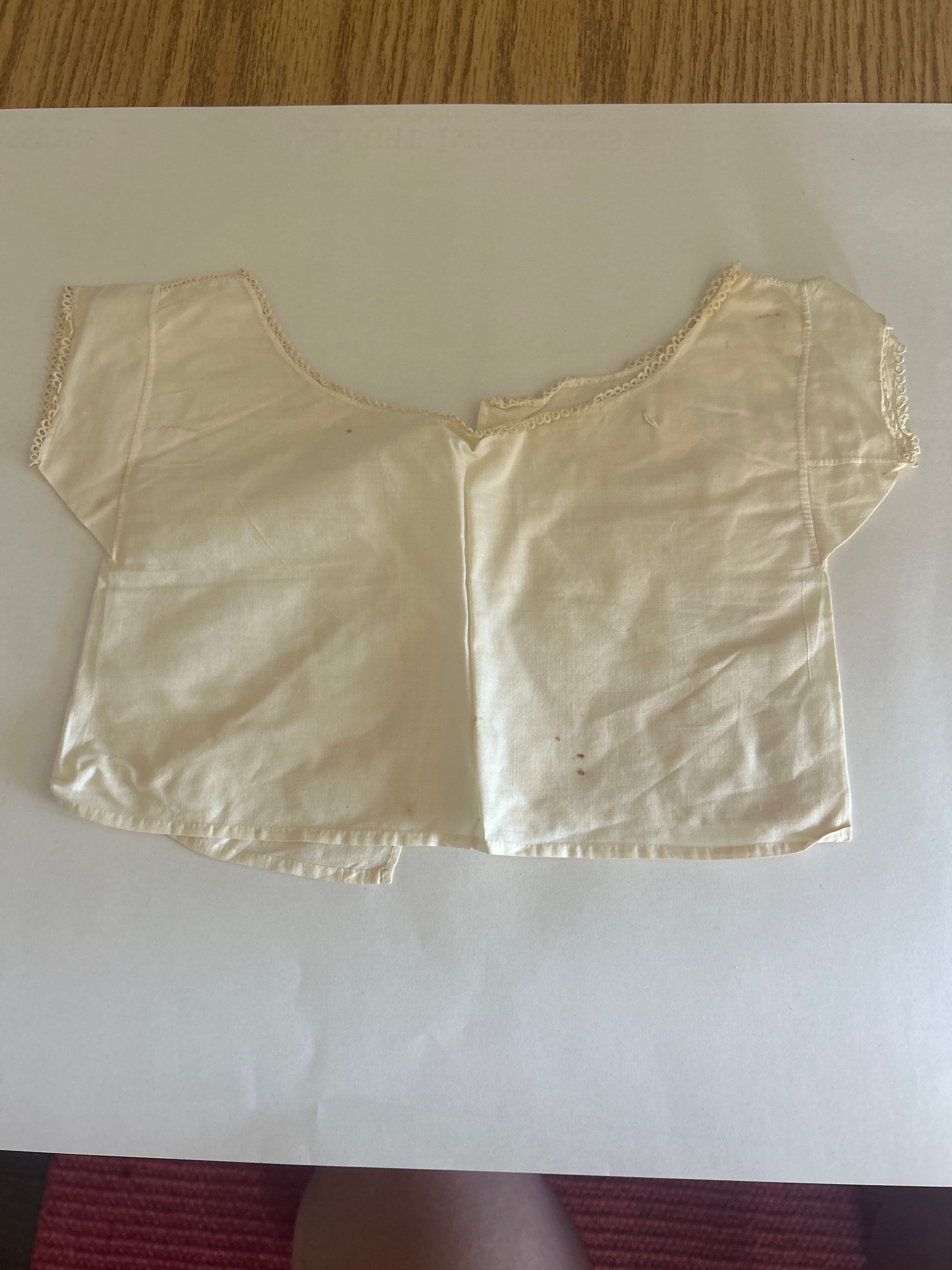 The infant's sack measures 9 inches from shoulder to hem and 6 3/4 inches from neck to hem, 10 3/4 inches wide, sleeves 1 1/2 inches long. Back is open. There are no fasteners. The edge of neck and sleeves is decorated with tatting approximately 1/4 inch wide.