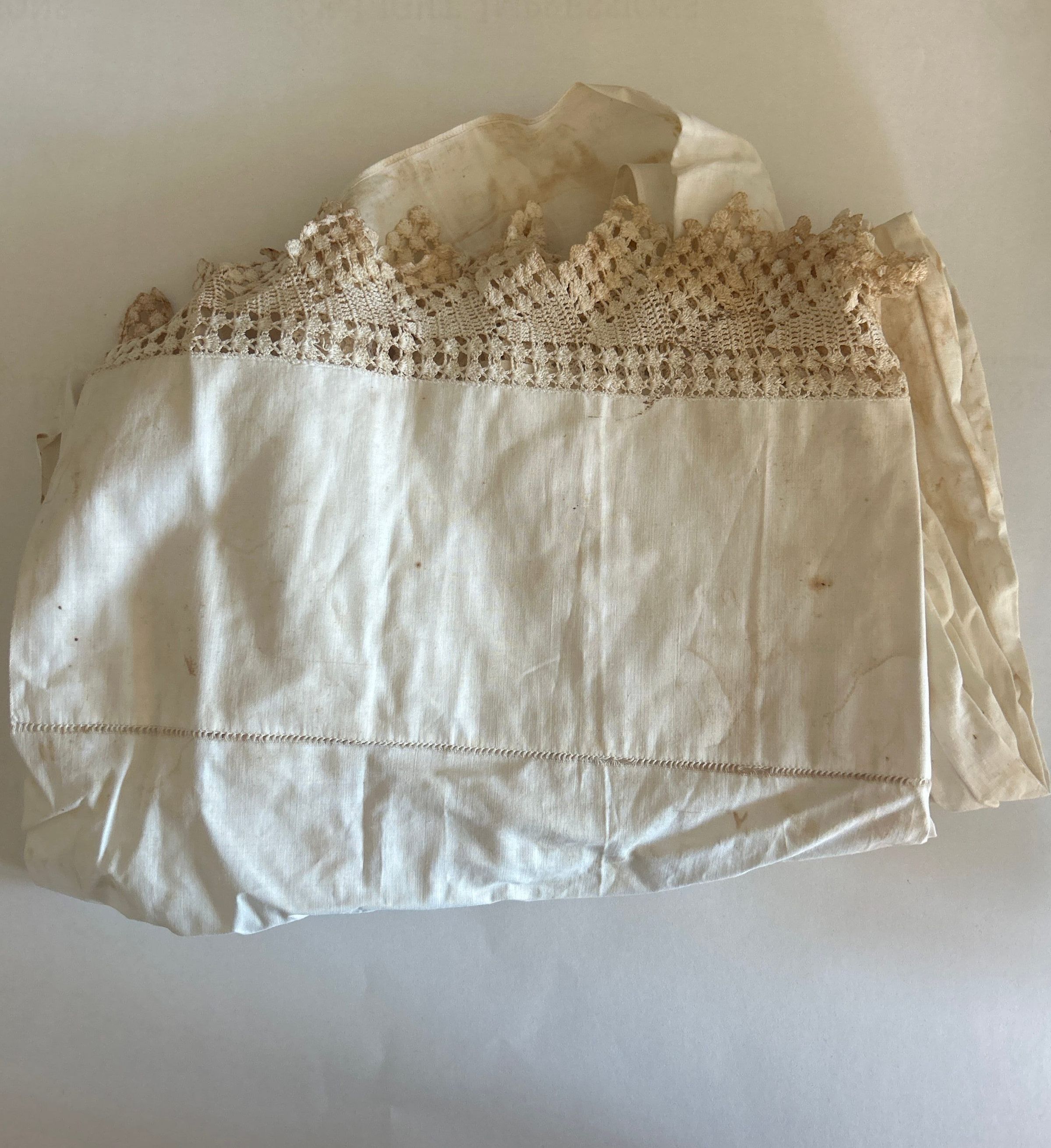 White cotton apron measures 28 inches from waist to hem, with lace edge, 1 3/4 inches - 2 1/4 inches wide, apron 36 inches wide and tied with 2 ties each approx. 38 inches long.